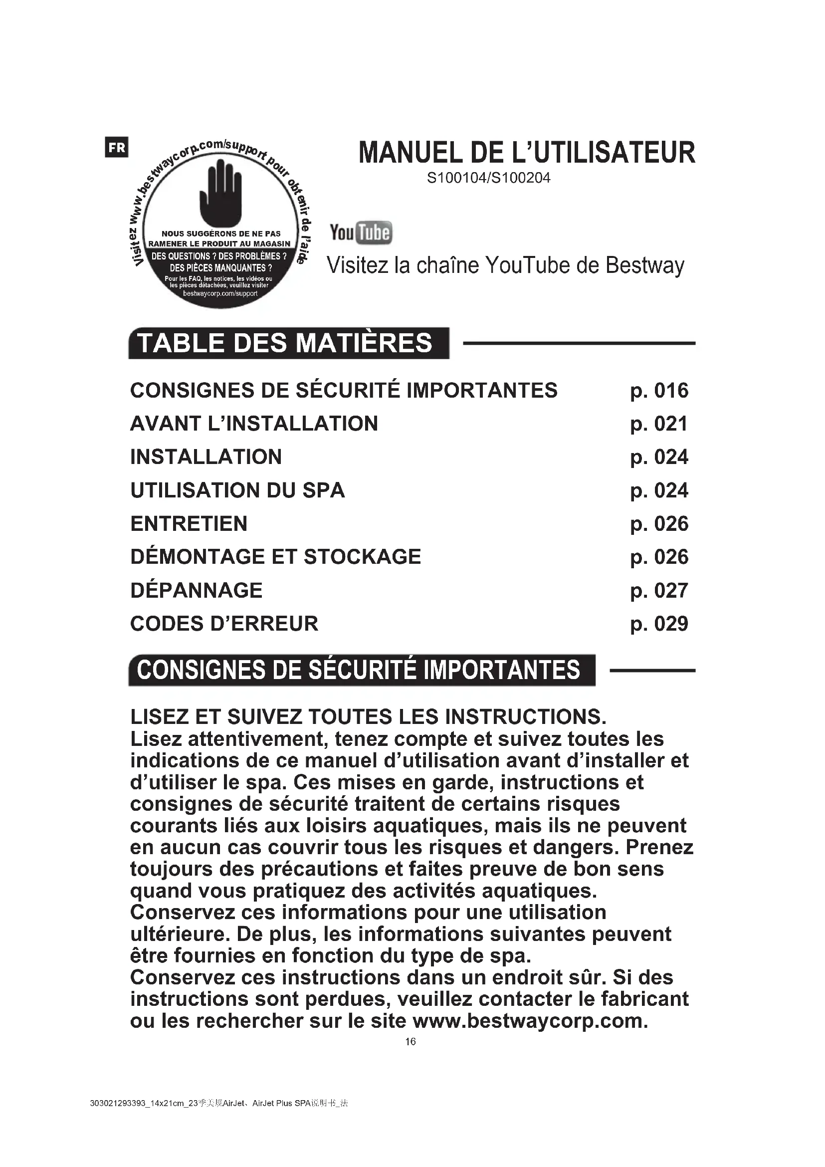 www.bestwaycorp.com. Wi-Fi module is damaged For assistance, please visit the support section on our website, www.bestwaycorp.com. NOTE: Press any button to remove alarm and continue to use the spa. Wi-Fi module connection failed. ERROR CODES 303021293393_14x21cm_23季美规AirJet、AirJet Plus SPA说明书_英CONSIGNES DE SÉCURITÉ IMPORTANTES LISEZ ET SUIVEZ TOUTES LES INSTRUCTIONS. Lisez attentivement, tenez compte et suivez toutes les indications de ce manuel d’utilisation avant d’installer et d’utiliser le spa. Ces mises en garde, instructions et consignes de sécurité traitent de certains risques courants liés aux loisirs aquatiques, mais ils ne peuvent en aucun cas couvrir tous les risques et dangers. Prenez toujours des précautions et faites preuve de bon sens quand vous pratiquez des activités aquatiques. Conservez ces informations pour une utilisation ultérieure. De plus, les informations suivantes peuvent être fournies en fonction du type de spa. Conservez ces instructions dans un endroit sûr. Si des instructions sont perdues, veuillez contacter le fabricant ou les rechercher sur le site www.bestwaycorp.com.