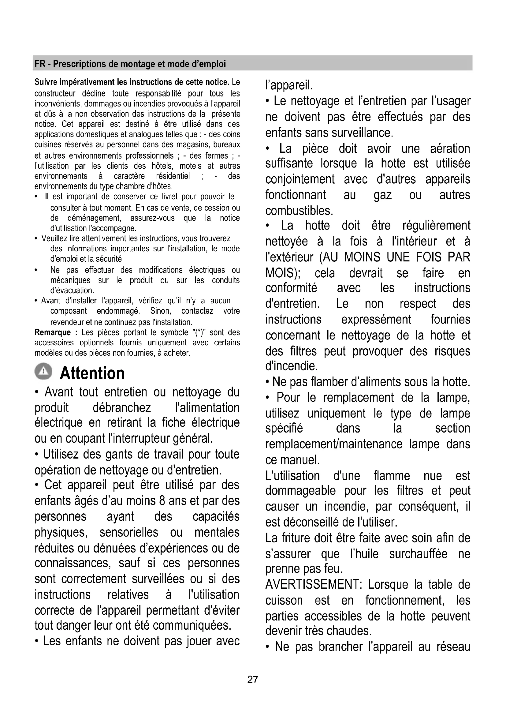 Put the grill back. If the lights do not work, make sure that the lamps are fitted properly into their housings before you call for technical assistance.27 FR - Prescriptions de montage et mode d’emploi Suivre impérativement les instructions de cette notice. Le constructeur décline toute responsabilité pour tous les inconvénients, dommages ou incendies provoqués à l’appareil et dûs à la non observation des instructions de la présente notice. Cet appareil est destiné à être utilisé dans des applications domestiques et analogues telles que : - des coins cuisines réservés au personnel dans des magasins, bureaux et autres environnements professionnels ; - des fermes ; - l’utilisation par les clients des hôtels, motels et autres environnements à caractère résidentiel ; - des environnements du type chambre d’hôtes.