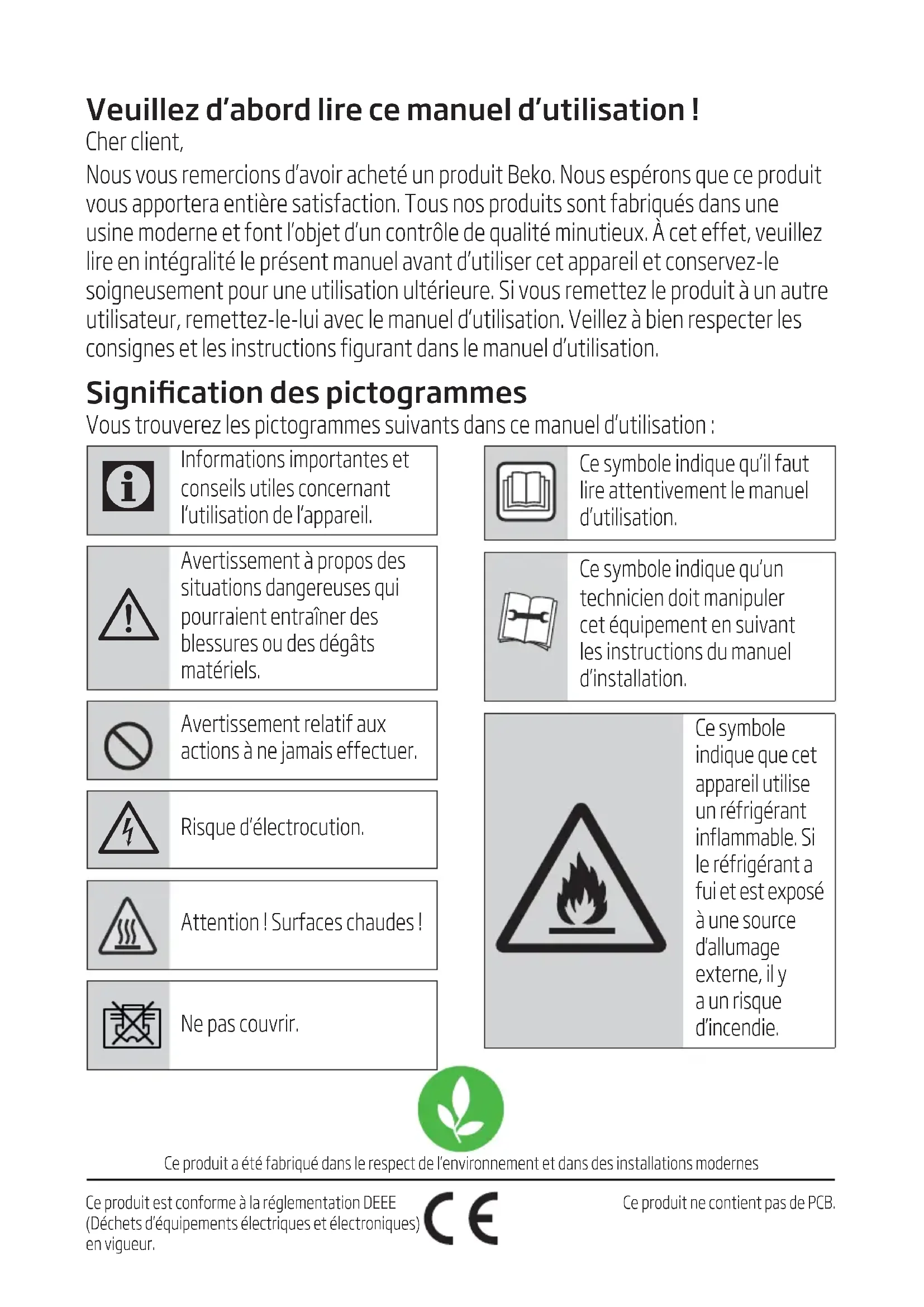 Nos vous remercions d'avoir acheté un produit BEKO. Nous espérons que ce produit vous apportera entière satisfaction. Tous nos produits sont fabriqués dans une usine moderne et font l'objet d'un contrôle de qualité minutieux. À cet effet, veuillez lire en intégralité le présent manuel avant d'utiliser cet appareil et conservez-le soigneusement pour une utilisation ultérieure. Si vous remettez le produit à un autre utilisateur, remettez-le-lui avec le manuel d'utilisation. Veillez à bien respecter les consignes et les instructions figurant dans le manuel d'utilisation.