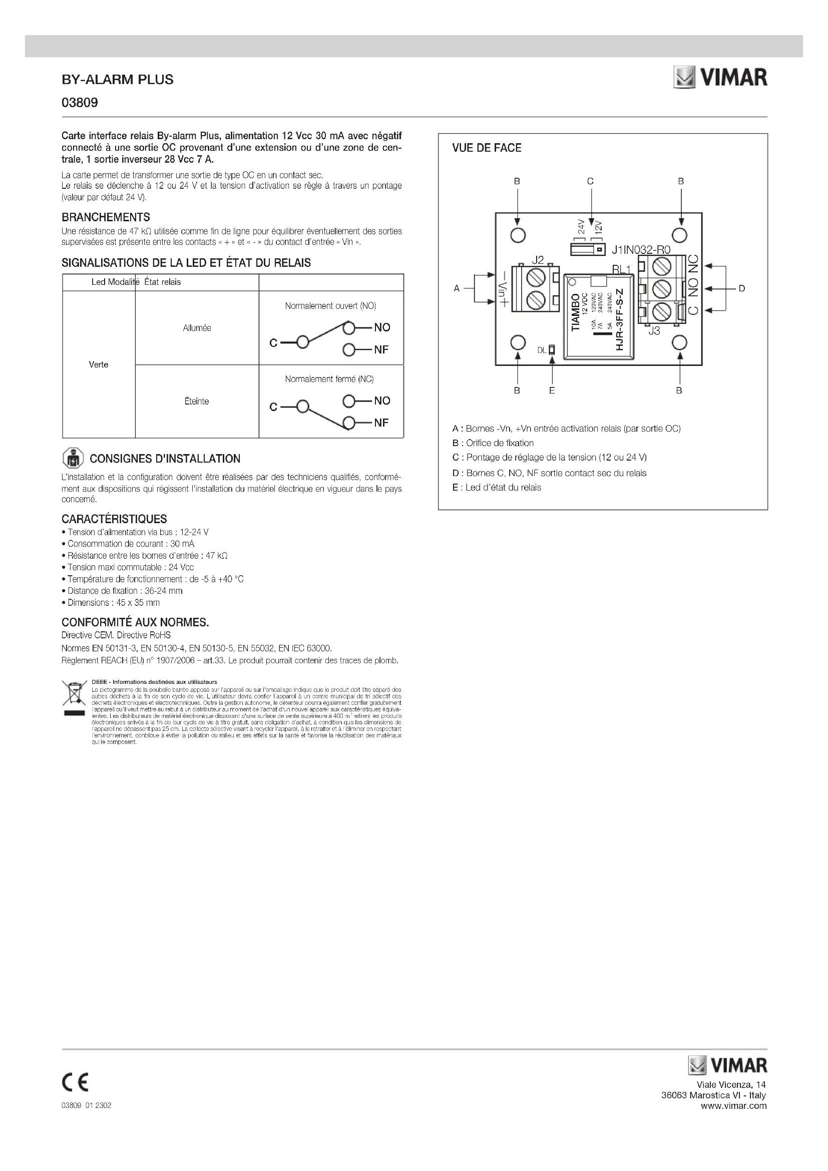 A : Bornes -Vn, +Vn entrée activation relais (par sortie OC)B : Orifice de fixation C : Pontage de réglage de la tension (12 ou 24 V)D : Bornes C, NO, NF sortie contact sec du relaisE : Led d’état du relais