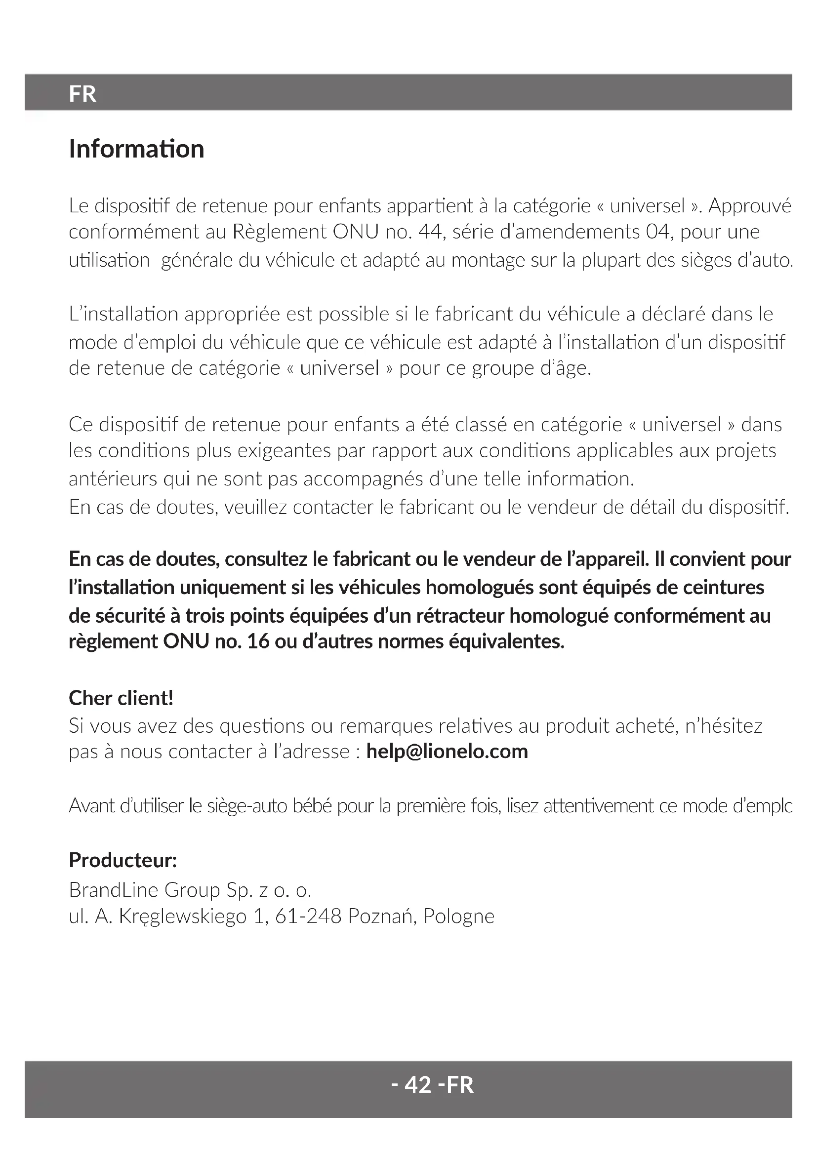 Informaon Le disposif de retenue pour enfants apparent à la catégorie « universel ». Approuvé conformément au Règlement ONU no. 44, série d’amendements 04, pour une ulisaon générale du véhicule et adapté au montage sur la plupart des sièges d’auto. L’installaon appropriée est possible si le fabricant du véhicule a déclaré dans le mode d’emploi du véhicule que ce véhicule est adapté à l’installaon d’un disposif de retenue de catégorie « universel » pour ce groupe d’âge. Ce disposif de retenue pour enfants a été classé en catégorie « universel » dans les condions plus exigeantes par rapport aux condions applicables aux projets antérieurs qui ne sont pas accompagnés d’une telle informaon. En cas de doutes, veuillez contacter le fabricant ou le vendeur de détail du disposif. En cas de doutes, consultez le fabricant ou le vendeur de l’appareil. Il convient pour l’installaon uniquement si les véhicules homologués sont équipés de ceintures de sécurité à trois points équipées d’un rétracteur homologué conformément au règlement ONU no. 16 ou d’autres normes équivalentes. Cher client! Si vous avez des quesons ou remarques relaves au produit acheté, n’hésitez pas à nous contacter à l’adresse : help@lionelo.com Avant d’uliser le siège-auto bébé pour la première fois, lisez aenvement ce mode d’emploi. Producteur: BrandLine Group Sp. z o. o. ul. A. Kręglewskiego 1, 61-248 Poznań, Pologne‑ 43 ‑ FR Renseignements importants Lisez ce mode d’emploi avant l’usage et gardez-le. Le mode d’emploi vous aidera à installer le siège correctement. Une installaon inappropriée peut présenter un danger pour la santé de l’enfant. Le fabricant ne sera pas tenu pour responsable de tous dangers éventuels causés par un montage inapproprié du siège-auto bébé. Le présent siège-auto bébé est desné aux groupes de masse I, II et III, ce qui signie qu’il peut être ulisé par les enfants de poids allant de 9 jusqu’à 36 kg. I groupe de masse: 9-18 kg, II groupe de masse: 15-25 kg, III groupe de masse: 22-36 kg.