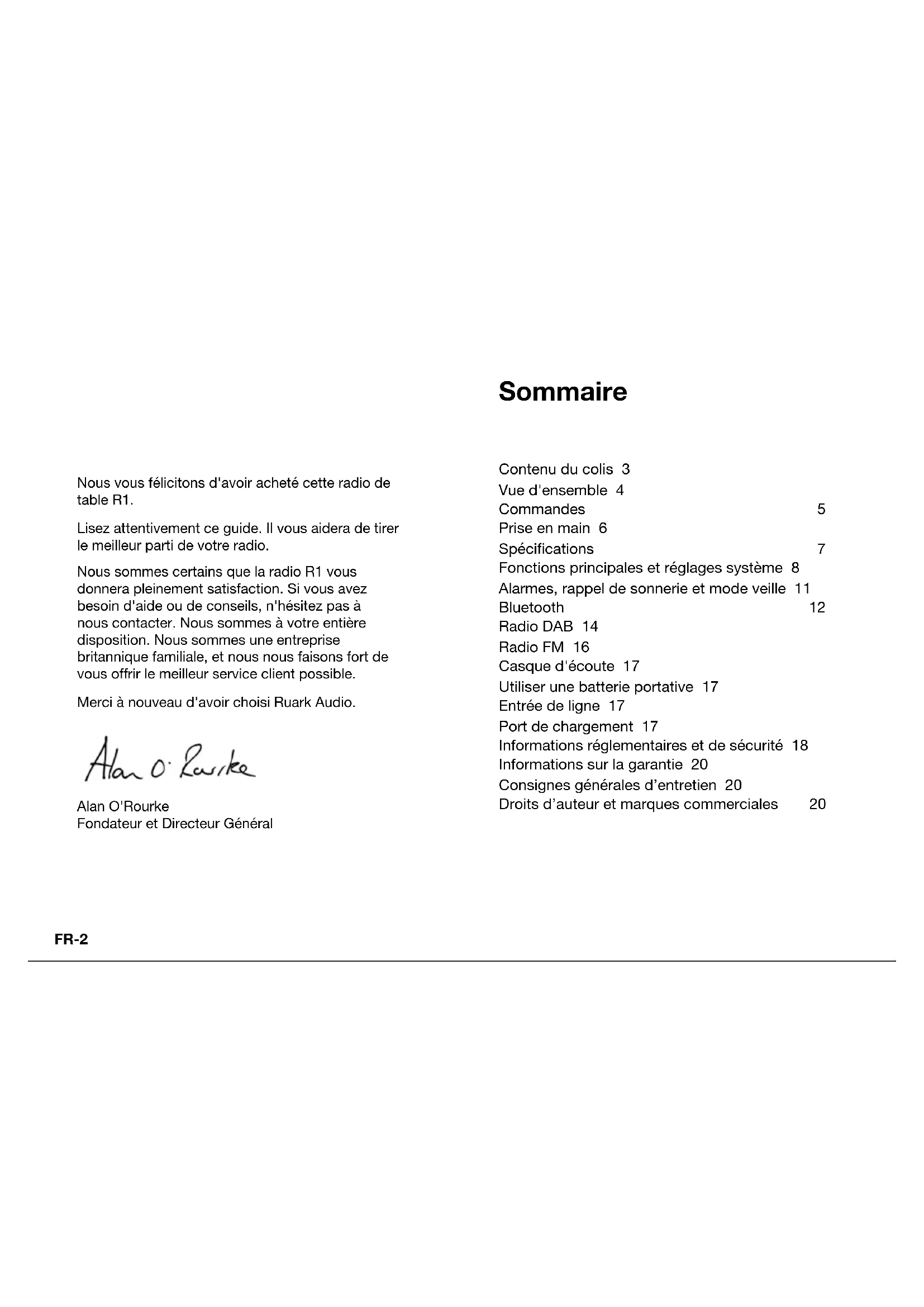 Radio de Table R1 mk3FR-2 Nous vous félicitons d'avoir acheté cette radio de table R1. Lisez attentivement ce guide. Il vous aidera de tirer le meilleur parti de votre radio. Nous sommes certains que la radio R1 vous donnera pleinement satisfaction. Si vous avez besoin d'aide ou de conseils, n'hésitez pas à nous contacter. Nous sommes à votre entière disposition. Nous sommes une entreprise britannique familiale, et nous nous faisons fort de vous offrir le meilleur service client possible. Merci à nouveau d'avoir choisi Ruark Audio. Alan O'Rourke Fondateur et Directeur Général Sommaire Contenu du colis 3 Vue d'ensemble 4 Commandes 5 Prise en main 6 Spécications 7 Fonctions principales et réglages système 8 Alarmes, rappel de sonnerie et mode veille 11 Bluetooth 12 Radio DAB 14 Radio FM 16 Casque d'écoute 17 Utiliser une batterie portative 17 Entrée de ligne 17 Port de chargement 17 Informations réglementaires et de sécurité 18 Informations sur la garantie 20 Consignes générales d’entretien 20 Droits d’auteur et marques commerciales 20FR-3