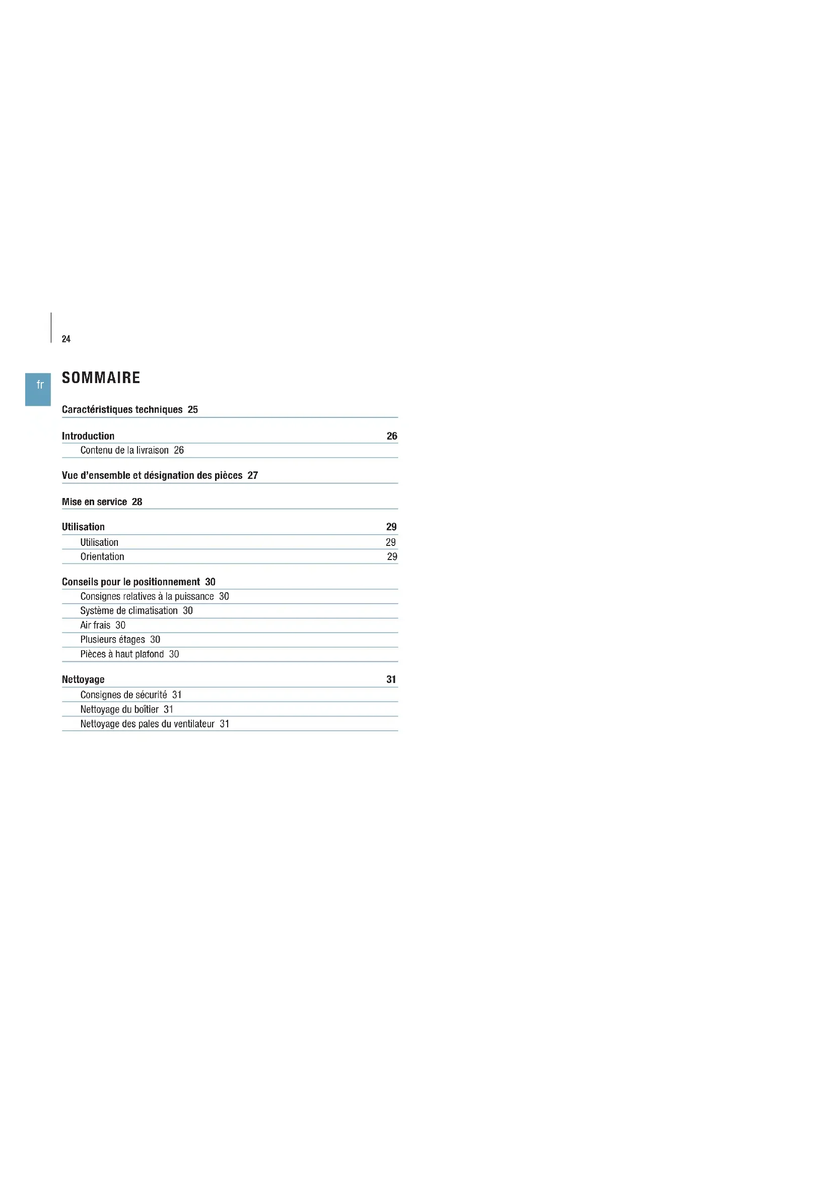 SOMMAIRE Caractéristiques techniques 25 Introduction 26 Contenu de la livraison 26 Vue d’ensemble et désignation des pièces 27 Mise en service 28 Utilisation 29 Utilisation 29 Orientation 29 Conseils pour le positionnement 30 Consignes relatives à la puissance 30 Système de climatisation 30 Air frais 30 Plusieurs étages 30 Pièces à haut plafond 30 Nettoyage 31 Consignes de sécurité 31 Nettoyage du boîtier 31 Nettoyage des pales du ventilateur 3125
