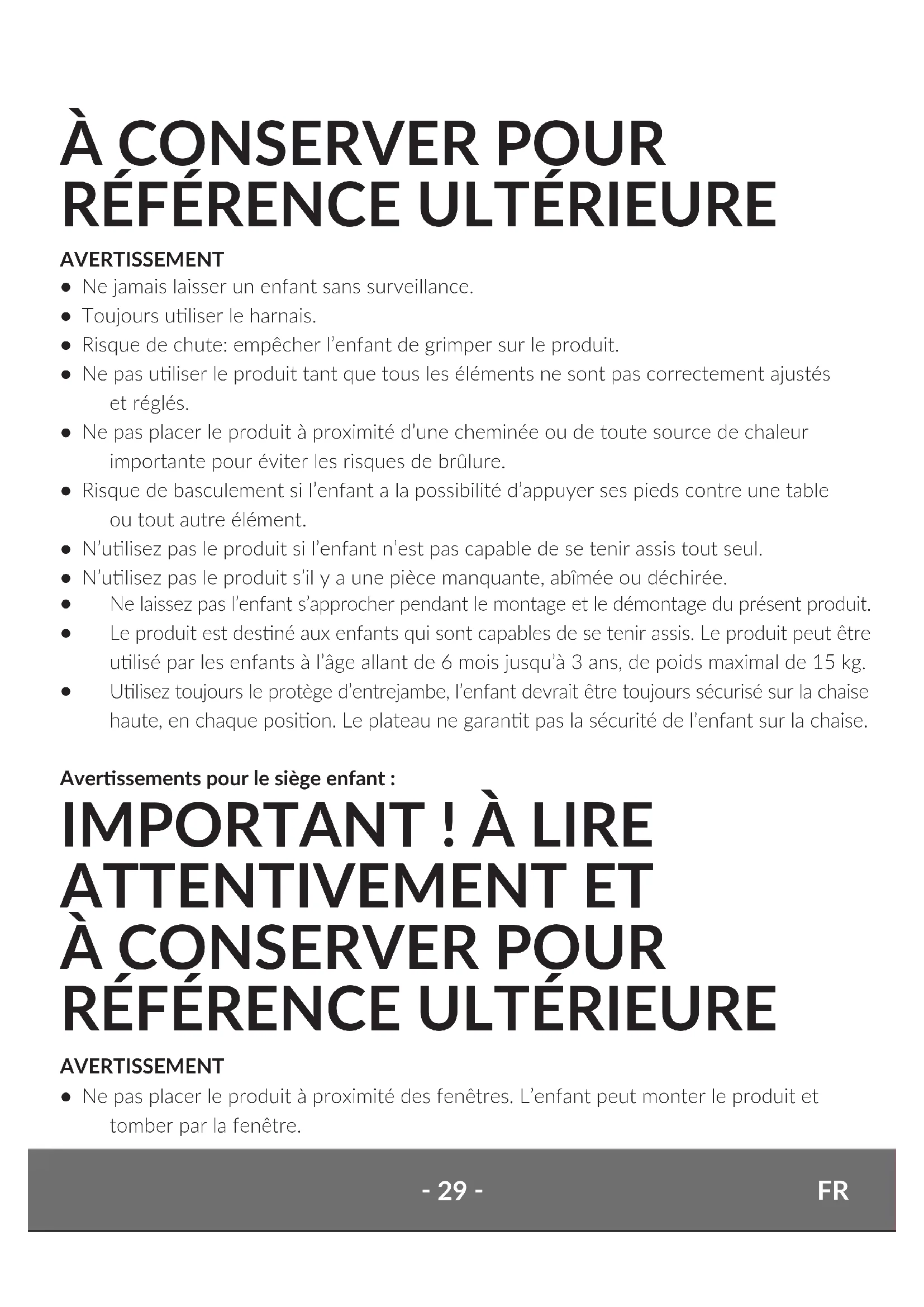 Ulisez toujours le protège d’entrejambe, l’enfant devrait être toujours sécurisé sur la chaise haute, en chaque posion. Le plateau ne garant pas la sécurité de l’enfant sur la chaise. Averssements pour le siège enfant : IMPORTANT ! À LIRE ATTENTIVEMENT ET À CONSERVER POUR