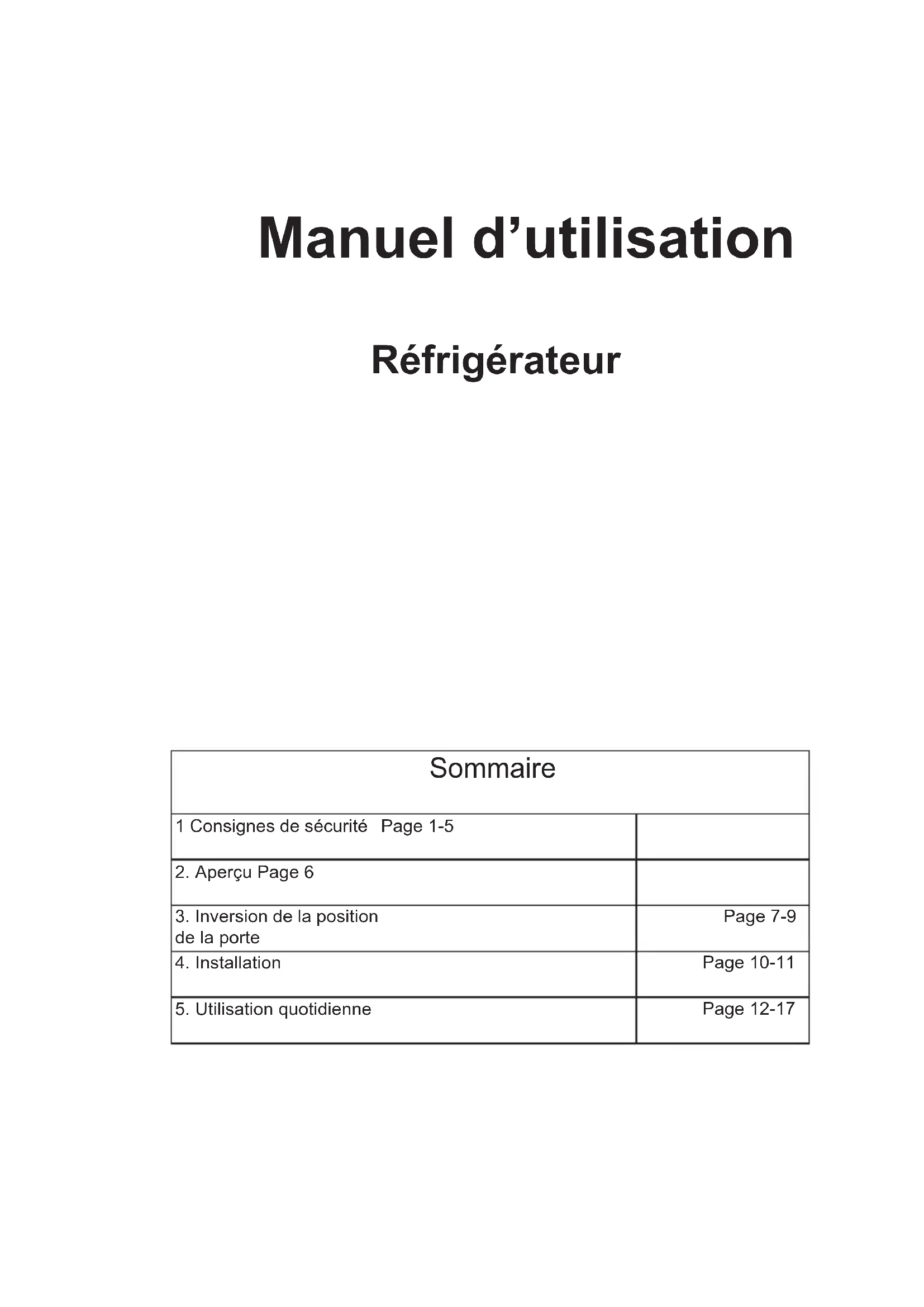 FRIGIDAIRE RS9050WN RS9050PNManuel d’utilisation Réfrigérateur Sommaire 1 Consignes de sécurité Page 1-5 2. Aperçu Page 6 3. Inversion de la positionde la portePage 7-9 4. InstallationPage 10-11 5. Utilisation quotidiennePage 12-17Consi
