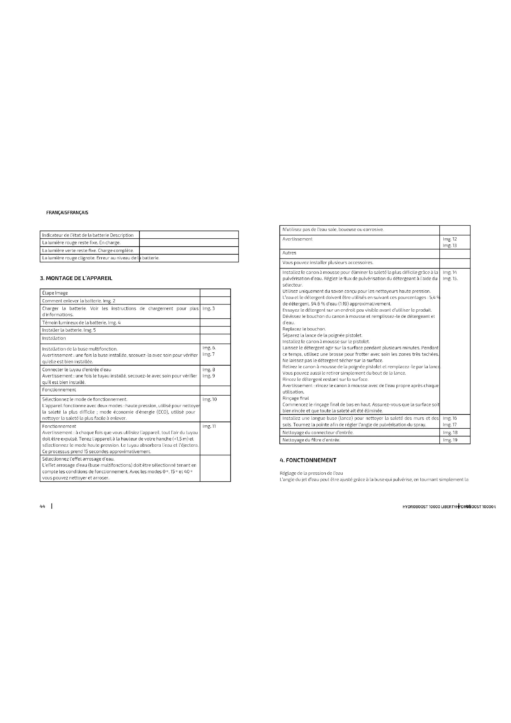 Problème Cause Solution Le témoin ECO clignote. Batterie faible. Chargez la batterie. L’appareil ne s’allume pas. Batterie faible. Chargez la batterie. Panne soudaine Température trop élevée ; la protection contre la surchaue s’est activée. Rallumez l’appareil une fois la température soit moins élevée. Peu d’eau. Blocage du ltrage qui provoque une moindre entrée d’eau. Nettoyez le ltre et l’entrée d’eau. Le tuyau est plié. Remplacez ou redressez le tuyau. L’eau contient des impuretés. Changez l’eau. L’appareil n’absorbe pas l’eau. Pertes dans l’entrée d’eau. Serrez le joint de l'entrée d'eau. Mauvaise connexion entre l’entrée d’eau et le connecteur. Assemblez-les correctement. Le ltre d’entrée d’eau n’est pas bien installé. Montez-le correctement. L'appareil prend plus de temps pour absorber l'eau. L’appareil est en mode «économie d’énergie». Désactivez le mode ECO pour que l’appareil puisse fonctionner comme d’habitude. La buse multifonction a des fuites. Elle n’est pas bien installée. Insérez la buse multifonction dans l’appareil puis tournez- la. La buse multifonction a des fuites. La buse n’est pas bien installée. Faites tourner la buse jusqu'à ce qu'elle s'adapte à la marque. Pourquoi ne puis-je pas recharger la batterie ? Vériez que le chargeur et la batterie sont compatibles. La batterie peut être seulement connectée avec le chargeur dans un seul sens. Tournez la batterie jusqu’à ce qu’elle puisse se connecter avec le chargeur. Le témoin rouge indiquera que l’appareil est en train de charger.HYDROBOOST 10000 LIBERTYHYDROBOOST 10000 LIBERTY