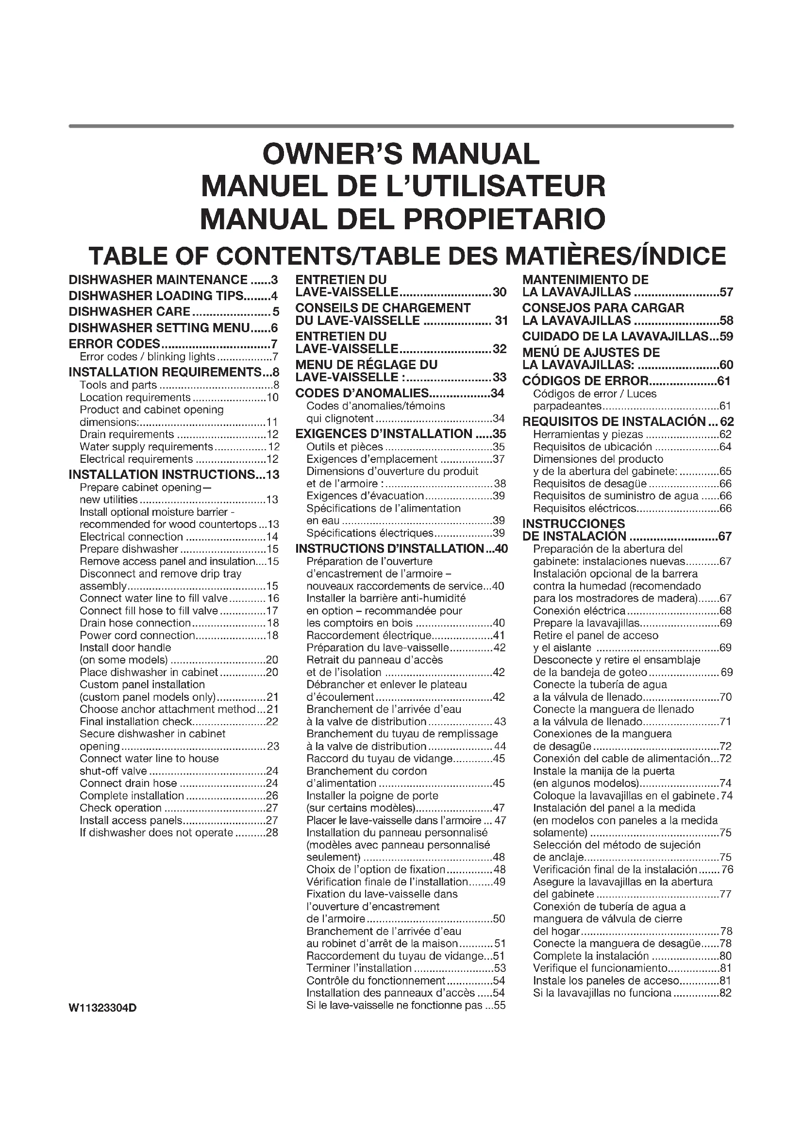 L’appareil doit être entièrement encastré (sur le dessus, les côtés, à l’arrière et au sol) dès l’installation. Un ensemble de panneaux latéraux est disponible chez votre marchand pour l’installation du lave-vaisselle à l’extrémité d’une rangée d’armoires. Une barrière anti-humidité en option est également offerte pour l’installation sous un plan de travail en bois. Inspecter l’emplacement d’installation du lave-vaisselle. Il doit comporter les caractéristiques suivantes: ■ Accès facile pour chargement et déchargement de la vaisselle. Dans le cas de l’installation dans un angle, on doit pouvoir établir un dégagement de 2po (5,1cm) ou plus entre le côté de la porte du lave-vaisselle et le mur ou l’armoire. ■ Facilité d’accès aux canalisations d’eau et d’évacuation et à la source d’électricité: ■ Une source d’électricité avec liaison à la terre est nécessaire. ■ Ce lave-vaisselle est doté d’une fonction de chauffage de l’eau et doit être raccordé à la canalisation d’alimentation en eau chaude. ■ Veiller à ce que les canalisations d’eau et d’évacuation et les câbles électriques se trouvent dans les limites de la zone marquée en gris illustrée dans la section «Dimensions du produit et de l’emplacement d’installation». ■ Ne pas placer de canalisation d’évacuation, canalisation d’eau ou câblage électrique à un endroit où cela susciterait interférence ou contact avec les pieds ou les moteurs du lave-vaisselle. ■ Protéger du gel le lave-vaisselle et les canalisations d’eau qui l’alimentent. La garantie de l’appareil ne couvre pas les dommages imputables au gel. REMARQUE: Si le lave-vaisselle ne doit pas être utilisé pendant une période prolongée ou s’il est laissé à un endroit qui pourrait être exposé au gel, veiller à faire exécuter les opérations de préhivernage par un technicien compétent. ■ S’il est installé dans une nouvelle construction, enlever tout débris de l’arrivée d’eau avant de la brancher à la valve de distribution. Les débris qui ne sont pas enlevés de l’eau pourraient obturer le filtre de la valve de distribution. ■ Une ouverture carrée offrant l’esthétique appropriée et permettant un fonctionnement correct. ■ La façade des armoires perpendiculaire au plancher. ■ Plancher de niveau. Conseil utile: S’il y a un écart de niveau sur le plancher entre l’avant et l’arrière de l’emplacement d’installation, il pourrait être nécessaire d’utiliser des cales pour établir l’aplomb de l’appareil. REMARQUE: Pour éviter tout déplacement des cales durant le fonctionnement du lave-vaisselle, les cales doivent être solidement fixées au plancher. ■ À l’emplacement d’installation du lave-vaisselle, on doit pouvoir établir le dégagement approprié entre le moteur et le plancher. Les moteurs ne doivent pas toucher le plancher. ■ Ne pas installer le lave-vaisselle par-dessus un tapis.38 DIMENSIONS D’OUVERTURE DU PRODUIT ET DE L’ARMOIRE: