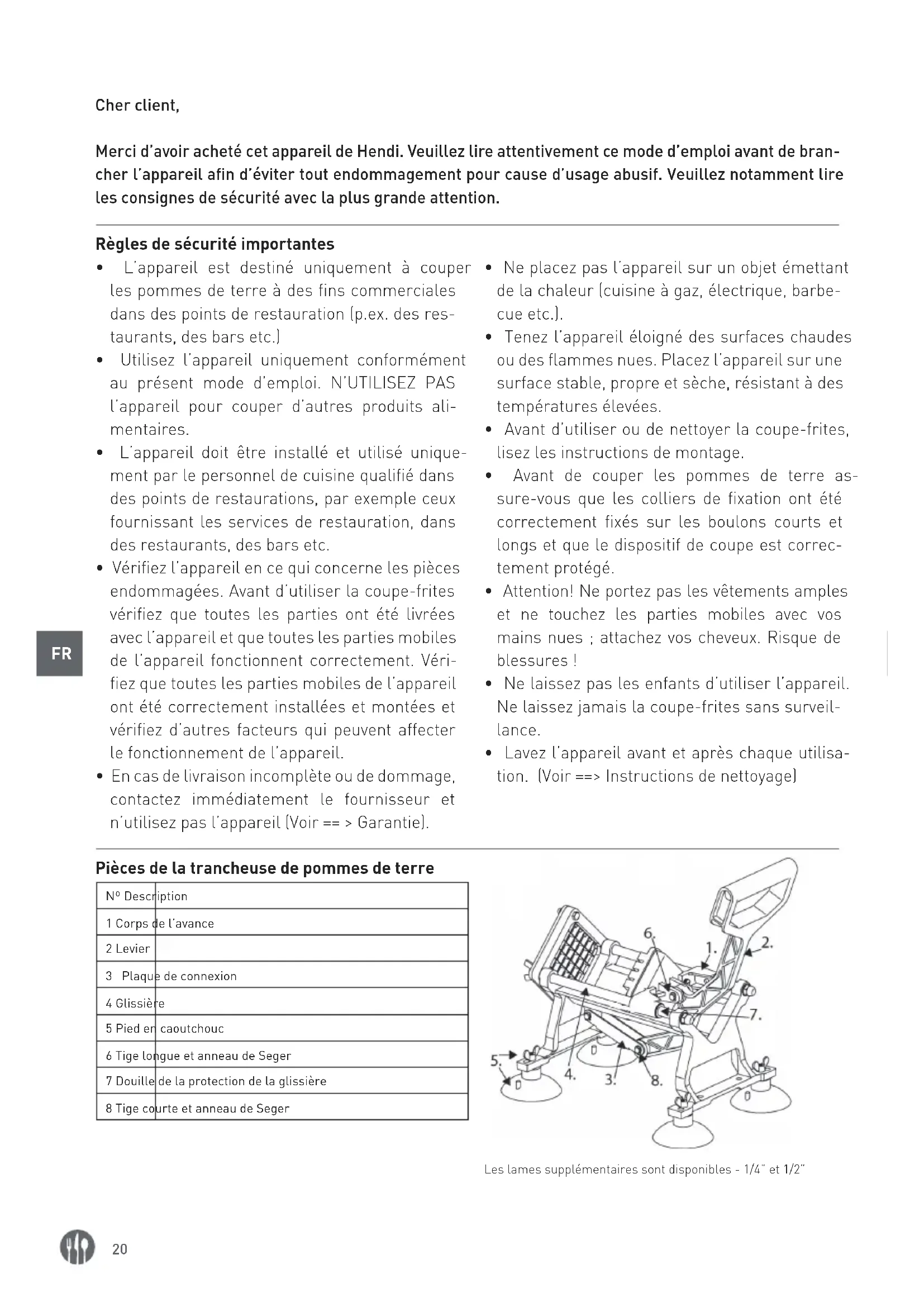 Cher client, Merci d’avoir acheté cet appareil de Hendi. Veuillez lire attentivement ce mode d’emploi avant de bran- cher l’appareil afin d’éviter tout endommagement pour cause d’usage abusif. Veuillez notamment lire les consignes de sécurité avec la plus grande attention. Règles de sécurité importantes