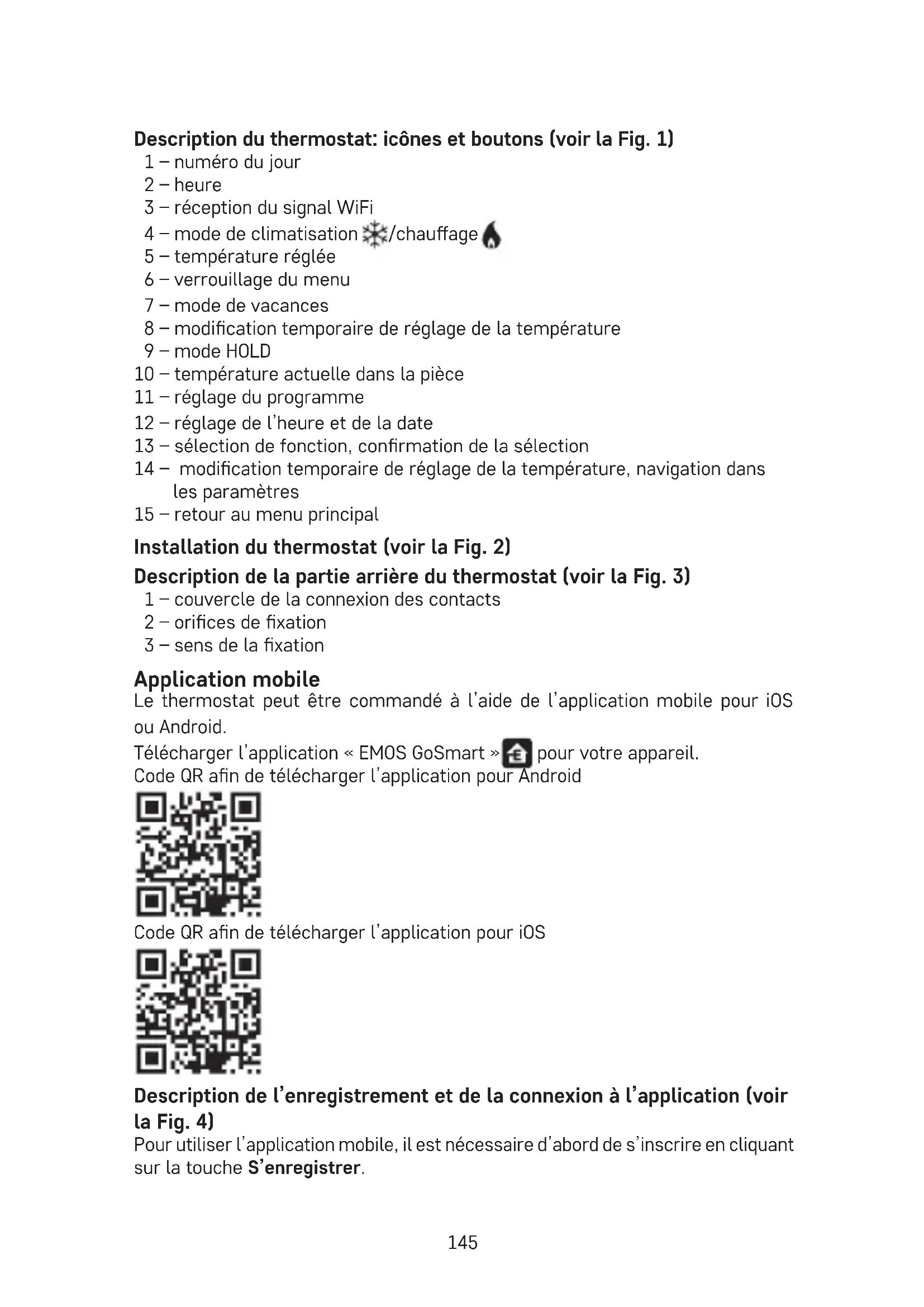 - Това устройство не е предназначено за използване от лица (включително деца), чиито физически, сетивни или умствени способности, както и липсата на опит или познания, биха им попречили на безопасното му използване. Та- кива лица трябва да бъдат инструктирани как да използват устройството и да са под надзора на лице, отговарящо за тяхната безопасност. Децата трябва винаги да се наблюдават и да не се допуска да си играят с устройството. ВНИМАНИЕ: Съдържанието на настоящото ръководство може да се променя без предизвестие. Поради ограничения при печата показаните тук символи могат малко да се различават от тези на екрана. Съдържанието на настоящото ръководство не може да се копира без разрешение от производителя. Не изхвърляйте електрически уреди с несортираните домакински отпа- дъци; предавайте ги в пунктовете за събиране на сортирани отпадъци. Актуална информация относно пунктовете за събиране на сортирани отпадъци може да получите от компетентните местни органи. При из- хвърляне на електрически уреди на сметищата е възможно в подпочвените води да попаднат опасни вещества, които след това да преминат в хранител- ната верига и да увредят здравето на хората. C настоящото EMOS spol. sr. o. декларира, че този тип радиосъоръжение P56201 е в съответствие с Директива 2014/53/ЕС. Цялостният текст на ЕС декларацията за съответствие може да се намери на следния интернет адрес: http://www.emos.eu/download. FR | Thermostat Le thermostat P56201 a été conçu pour gérer des systèmes de chauage et de climatisation. Avertissements importants Avant la première utilisation, lire attentivement la notice du thermostat, mais aussi celle de la chaudière ou de l’installation de climatisation. Avant d’installer le thermostat, il est nécessaire de couper l’alimentation électrique! Nous recommandons de coner l’installation à du personnel qualié! Lors de l’installation, il est nécessaire de respecter les normes prescrites. Spécications techniques: Charge commutée: max. 230 V AC; 6 A pour une charge résistive; 2 A pour une charge inductive Mesure de la température: 0 °C à 40 °C avec une résolution de 0,1 °C; précision de ±1 °C à 20 °C Réglage de la température: 5 °C à 35 °C, par pas de 0,5 °C Variation de la température réglée: 0,2 °C à 2 °C, par pas de 0,1 °C Température de fonctionnement: 0 °C à 40 °C Frequence WiFi: 2,4 GHz, 25 mW e.i.r.p. max. Alimentation: 230 V AC/50 Hz Dimensions: 138 × 88 × 33 mm145 Description du thermostat: icônes et boutons (voir la Fig. 1) 1 – numéro du jour 2 – heure 3 – réception du signal WiFi 4 – mode de climatisation /chauage 5 – température réglée 6 – verrouillage du menu 7 – mode de vacances 8 – modication temporaire de réglage de la température 9 – mode HOLD 10 – température actuelle dans la pièce 11 – réglage du programme 12 – réglage de l’heure et de la date 13 – sélection de fonction, conrmation de la sélection 14 – modication temporaire de réglage de la température, navigation dans les paramètres 15 – retour au menu principal Installation du thermostat (voir la Fig. 2) Description de la partie arrière du thermostat (voir la Fig. 3) 1 – couvercle de la connexion des contacts 2 – orices de xation 3 – sens de la xation Application mobile Le thermostat peut être commandé à l’aide de l’application mobile pour iOS ou Android. Télécharger l’application « EMOS GoSmart » pour votre appareil. Code QR an de télécharger l’application pour Android Code QR an de télécharger l’application pour iOS Description de l’enregistrement et de la connexion à l’application (voir la Fig. 4) Pour utiliser l’application mobile, il est nécessaire d’abord de s’inscrire en cliquant sur la touche S’enregistrer.146 Entrer votre pays et votre adresse e-mail, cocher la case de l’acceptation des conditions d’utilisation et cliquer sur Obtenir le code de vérication. Saisir le code de vérication qui vous a été envoyé à l’adresse e-mail. Dénir ensuite le mot de passe de votre compte, puis cliquer sur Terminé. Selon votre choix, sélectionner Analyse des données/Personnalisation et cliquer sur Accéder à l’application. Connexion du thermostat à un réseau WiFi pour le contrôle via l’appli- cation mobile (voir la Fig. 5) Appuyer sur le bouton pendant 5 secondes. Puis, appuyer sur le bouton pendant 3 secondes. L’écran ache E2 et l’icône se met à clignoter. Dans l’application, cliquer sur Ajouter un appareil, puis permettre l’accès à la localisation. Sélectionner la recherche manuelle d’appareil Petits appareils électroménagers: Thermostat (WiFi) ou Autres: Autres (WiFi). Sélectionner un réseau Wi de 2,4 GHz, saisir le mot de passe et cliquer sur Suivant. Cocher Conrmez que l’icône clignote rapidement et cliquer sur Suivant. Dans 