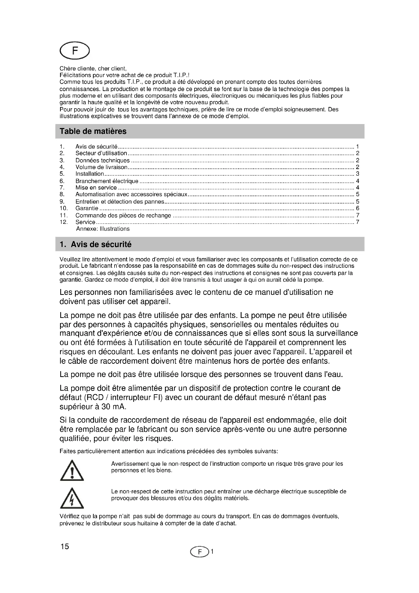 - Chère cliente, cher client, Félicitations pour votre achat de ce produit T.I.P.! Comme tous les produits T.I.P., ce produit a été développé en prenant compte des toutes dernières connaissances. La production et le montage de ce produit se font sur la base de la technologie des pompes la plus moderne et en utilisant des composants électriques, électroniques ou mécaniques les plus fiables pour garantir la haute qualité et la longévité de votre nouveau produit. Pour pouvoir jouir de tous les avantages techniques, prière de lire ce mode d’emploi soigneusement. Des illustrations explicatives se trouvent dans l’annexe de ce mode d’emploi. Table de matières 1. Avis de sécurité p. 1