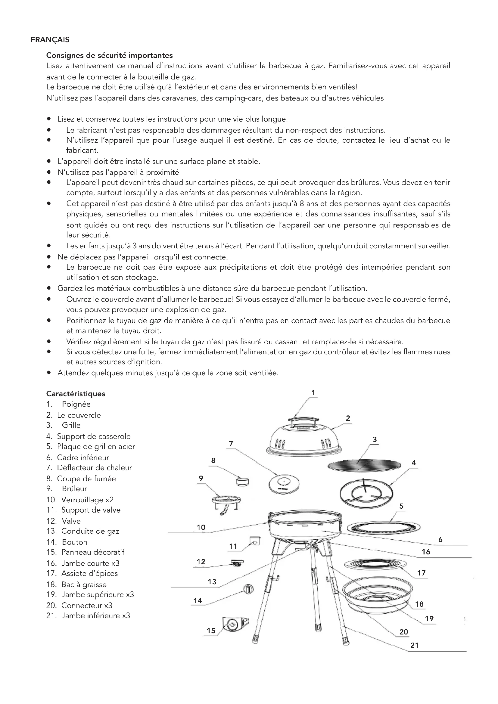 Consignes de sécurité importantes Lisez attentivement ce manuel d’instructions avant d’utiliser le barbecue à gaz. Familiarisez-vous avec cet appareil avant de le connecter à la bouteille de gaz. Le barbecue ne doit être utilisé qu’à l’extérieur et dans des environnements bien ventilés! N’utilisez pas l’appareil dans des caravanes, des camping-cars, des bateaux ou d’autres véhicules