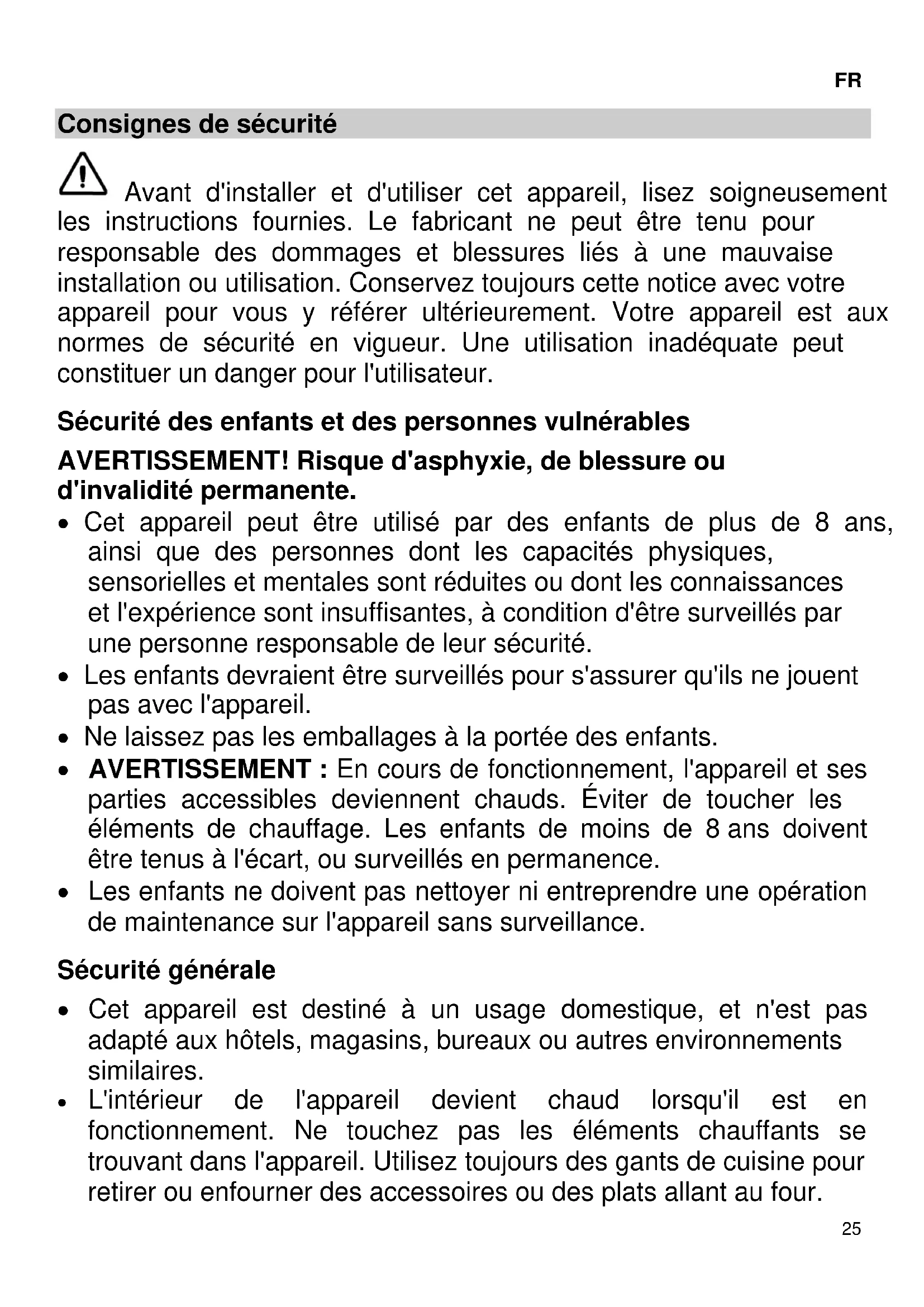 Consignes de sécurité Avant d'installer et d'utiliser cet appareil, lisez soigneusement les instructions fournies. Le fabricant ne peut être tenu pour responsable des dommages et blessures liés à une mauvaise installation ou utilisation. Conservez toujours cette notice avec votre appareil pour vous y référer ultérieurement. Votre appareil est aux normes de sécurité en vigueur. Une utilisation inadéquate peut constituer un danger pour l'utilisateur. Sécurité des enfants et des personnes vulnérables AVERTISSEMENT! Risque d'asphyxie, de blessure ou d'invalidité permanente.