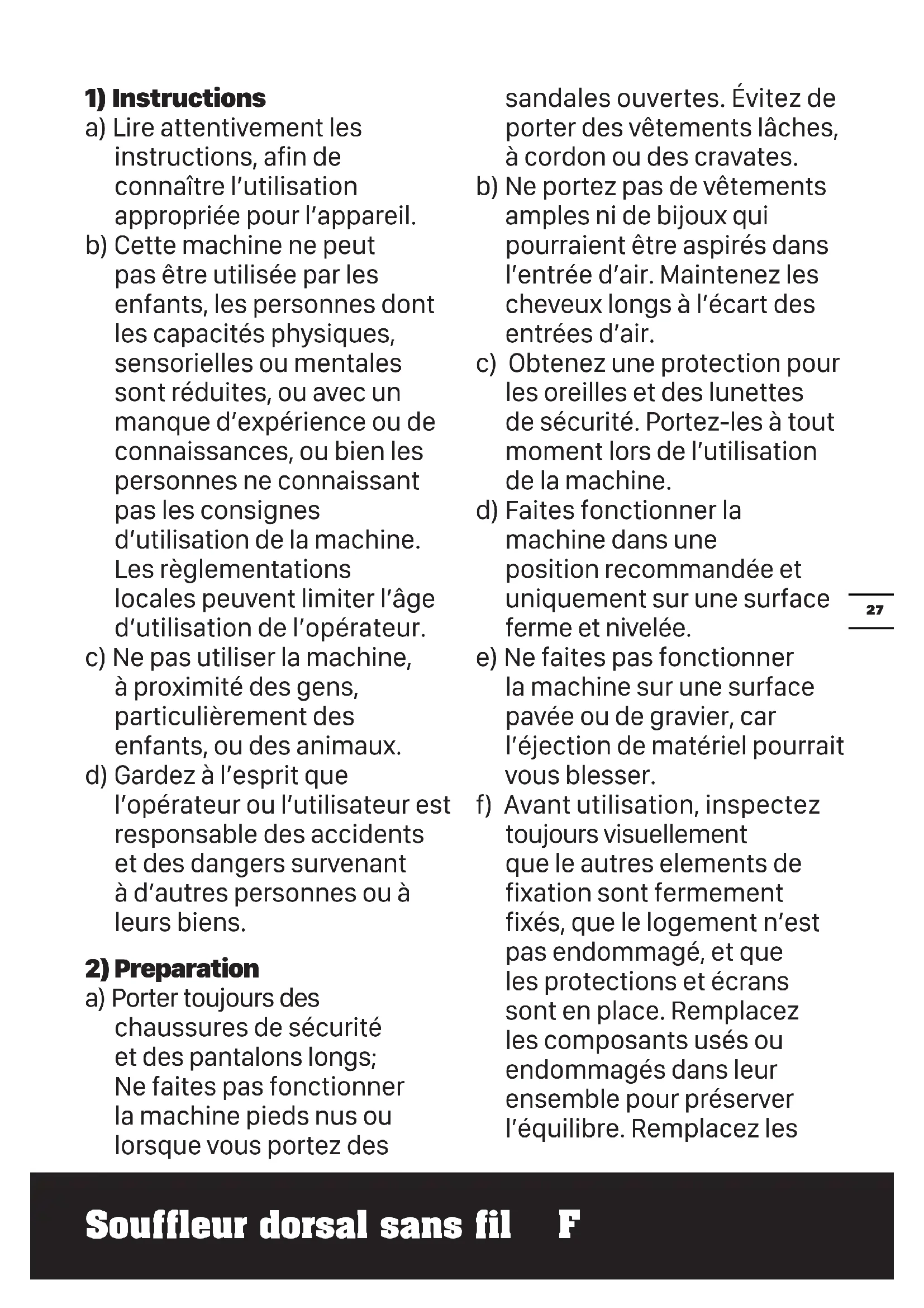 a) Porter toujours des chaussures de sécurité et des pantalons longs; Ne faites pas fonctionner la machine pieds nus ou lorsque vous portez des sandales ouvertes. Évitez de porter des vêtements lâches, à cordon ou des cravates. b) Ne portez pas de vêtements amples ni de bijoux qui pourraient être aspirés dans l’entrée d’air. Maintenez les cheveux longs à l’écart des entrées d’air. c) Obtenez une protection pour les oreilles et des lunettes de sécurité. Portez-les à tout moment lors de l’utilisation de la machine. d) Faites fonctionner la machine dans une position recommandée et uniquement sur une surface ferme et nivelée. e) Ne faites pas fonctionner la machine sur une surface pavée ou de gravier, car l’éjection de matériel pourrait vous blesser. f) Avant utilisation, inspectez toujours visuellement que le autres elements de fixation sont fermement fixés, que le logement n’est pas endommagé, et que les protections et écrans sont en place. Remplacez les composants usés ou endommagés dans leur ensemble pour préserver l’équilibre. Remplacez lesSouffleur dorsal sans fil F