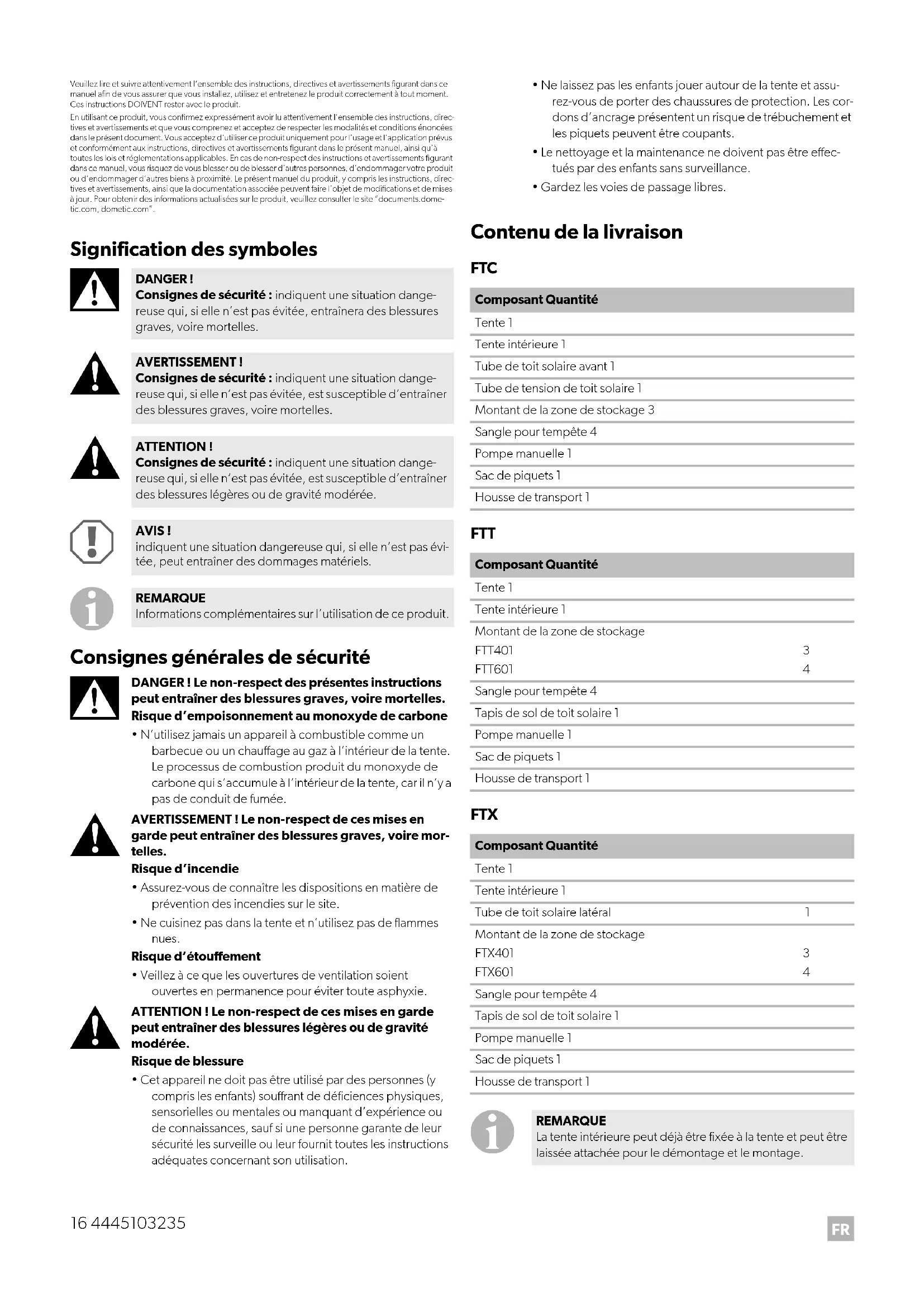 DANGER ! Consignes de sécurité : indiquent une situation dange- reuse qui, si elle n’est pas évitée, entraînera des blessures graves, voire mortelles. AVERTISSEMENT ! Consignes de sécurité : indiquent une situation dange- reuse qui, si elle n’est pas évitée, est susceptible d’entraîner des blessures graves, voire mortelles. ATTENTION ! Consignes de sécurité : indiquent une situation dange- reuse qui, si elle n’est pas évitée, est susceptible d’entraîner des blessures légères ou de gravité modérée. AVIS ! indiquent une situation dangereuse qui, si elle n’est pas évi- tée, peut entraîner des dommages matériels. REMARQUE Informations complémentaires sur l’utilisation de ce produit. Composant Quantité Tente 1 Tente intérieure 1 Tube de toit solaire avant 1 Tube de tension de toit solaire 1 Montant de la zone de stockage 3 Sangle pour tempête 4 Pompe manuelle 1 Sac de piquets 1 Housse de transport 1 Composant Quantité Tente 1 Tente intérieure 1 Montant de la zone de stockage FTT401 FTT601