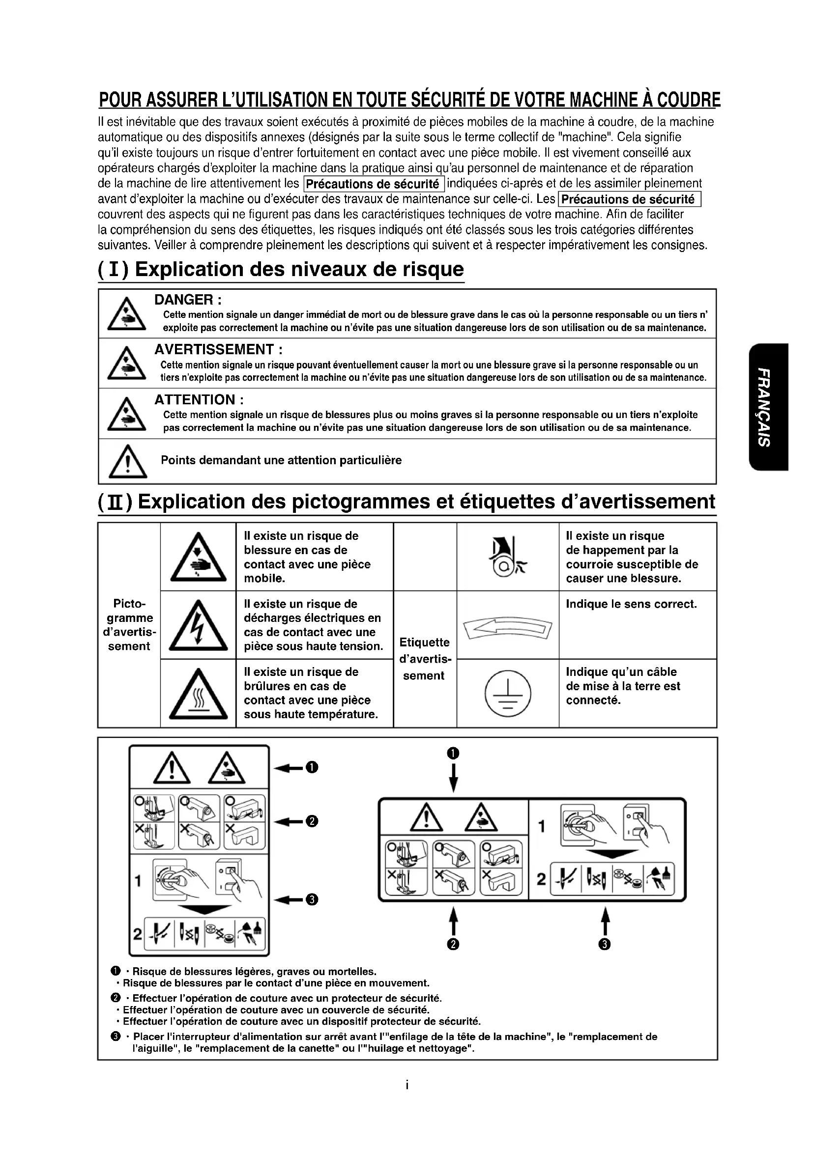 - Placer l'interrupteur d'alimentation sur arrêt avant l'"enfi lage de la tête de la machine", le "remplacement de l'aiguille", le "remplacement de la canette" ou l'"huilage et nettoyage". Il est inévitable que des travaux soient exécutés à proximité de pièces mobiles de la machine à coudre, de la machine automatique ou des dispositifs annexes (désignés par la suite sous le terme collectif de "machine". Cela signifi e qu’il existe toujours un risque d’entrer fortuitement en contact avec une pièce mobile. Il est vivement conseillé aux opérateurs chargés d’exploiter la machine dans la pratique ainsi qu’au personnel de maintenance et de réparation de la machine de lire attentivement les Précautions de sécurité indiquées ci-après et de les assimiler pleinement avant d’exploiter la machine ou d’exécuter des travaux de maintenance sur celle-ci. Les Précautions de sécurité couvrent des aspects qui ne fi gurent pas dans les caractéristiques techniques de votre machine. Afi n de faciliter la compréhension du sens des étiquettes, les risques indiqués ont été classés sous les trois catégories différentes suivantes. Veiller à comprendre pleinement les descriptions qui suivent et à respecter impérativement les consignes. POUR ASSURER L’UTILISATION EN TOUTE SÉCURITÉ DE VOTRE MACHINE À COUDRE