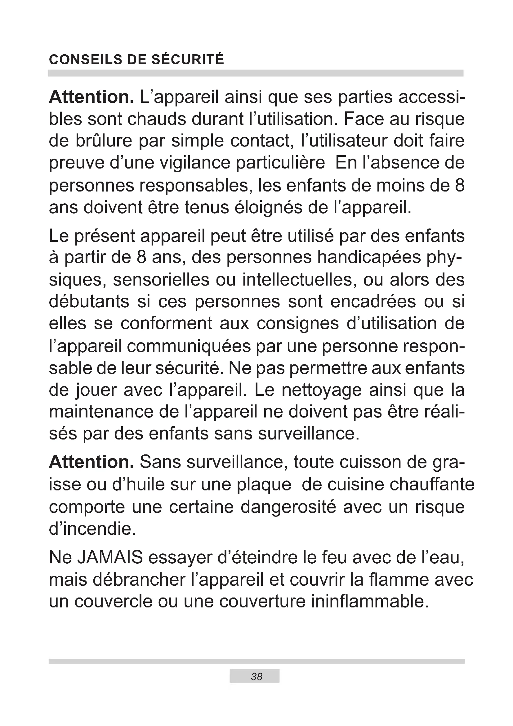 Attention. L’appareil ainsi que ses parties accessi- bles sont chauds durant l’utilisation. Face au risque de brûlure par simple contact, l’utilisateur doit faire preuve d’une vigilance particulière En l’absence de personnes responsables, les enfants de moins de 8 ans doivent être tenus éloignés de l’appareil. Le présent appareil peut être utilisé par des enfants à partir de 8 ans, des personnes handicapées phy- siques, sensorielles ou intellectuelles, ou alors des débutants si ces personnes sont encadrées ou si elles se conforment aux consignes d’utilisation de l’appareil communiquées par une personne respon- sable de leur sécurité. Ne pas permettre aux enfants de jouer avec l’appareil. Le nettoyage ainsi que la maintenance de l’appareil ne doivent pas être réali- sés par des enfants sans surveillance. Attention. Sans surveillance, toute cuisson de gra- isse ou d’huile sur une plaque de cuisine chauante comporte une certaine dangerosité avec un risque d’incendie. Ne JAMAIS essayer d’éteindre le feu avec de l’eau, mais débrancher l’appareil et couvrir la amme avec un couvercle ou une couverture ininammable.39