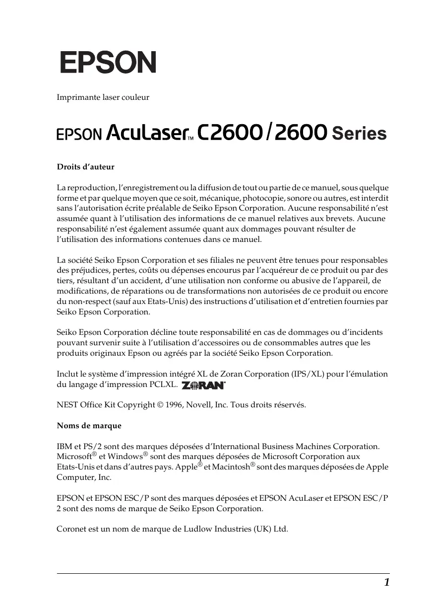 Imprimante laser couleur Droits d’auteur La reproduction, l’enregistrement ou la diffusion de tout ou partie de ce manuel, sous quelque forme et par quelque moyen que ce soit, mécanique, photocopie, sonore ou autres, est interdit sans l’autorisation écrite préalable de Seiko Epson Corporation. Aucune responsabilité n’est assumée quant à l’utilisation des informations de ce manuel relatives aux brevets. Aucune responsabilité n’est également assumée quant aux dommages pouvant résulter de l’utilisation des informations contenues dans ce manuel. La société Seiko Epson Corporation et ses filiales ne peuvent être tenues pour responsables des préjudices, pertes, coûts ou dépenses encourus par l’acquéreur de ce produit ou par des tiers, résultant d’un accident, d’une utilisation non conforme ou abusive de l’appareil, de modifications, de réparations ou de transformations non autorisées de ce produit ou encore du non-respect (sauf aux Etats-Unis) des instructions d’utilisation et d’entretien fournies par Seiko Epson Corporation. Seiko Epson Corporation décline toute responsabilité en cas de dommages ou d’incidents pouvant survenir suite à l’utilisation d’accessoires ou de consommables autres que les produits originaux Epson ou agréés par la société Seiko Epson Corporation. Inclut le système d’impression intégré XL de Zoran Corporation (IPS/XL) pour l’émulation du langage d’impression PCLXL. NEST Office Kit Copyright © 1996, Novell, Inc. Tous droits réservés. Noms de marque IBM et PS/2 sont des marques déposées d’International Business Machines Corporation. Microsoft® et Windows® sont des marques déposées de Microsoft Corporation aux Etats-Unis et dans d’autres pays. Apple® et Macintosh® sont des marques déposées de Apple Computer, Inc. EPSON et EPSON ESC/P sont des marques déposées et EPSON AcuLaser et EPSON ESC/P 2 sont des noms de marque de Seiko Epson Corporation. Coronet est un nom de marque de Ludlow Industries (UK) Ltd.