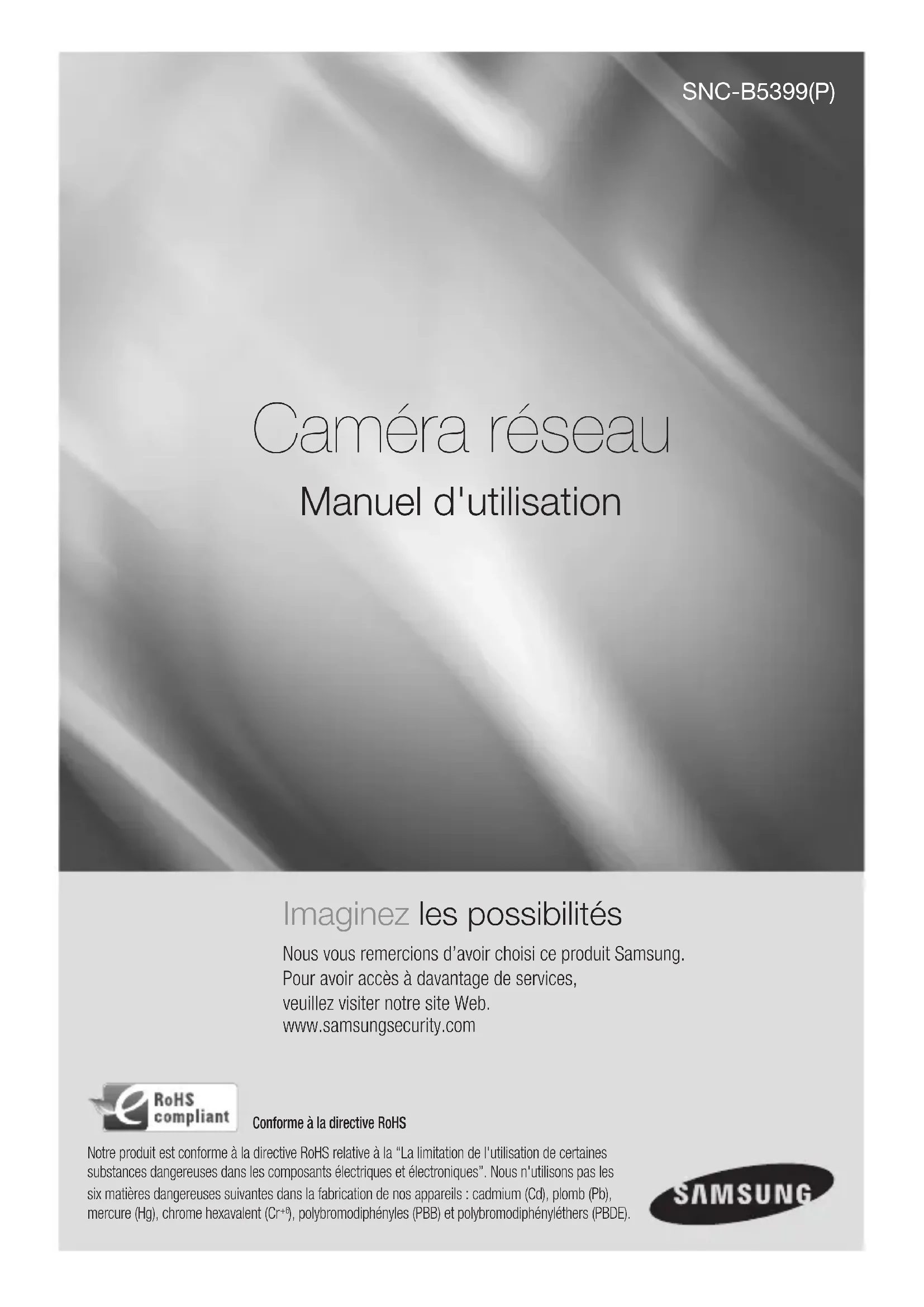 SNC-B5399(P) Imaginez les possibilités Nous vous remercions d’avoir choisi ce produit Samsung. Pour avoir accès à davantage de services, veuillez visiter notre site Web. www.samsungsecurity.com Manuel d'utilisation Caméra réseau Conforme à la directive RoHSNotre produit est conforme à la directive RoHS relative à la “La limitation de l'utilisation de certaines substances dangereuses dans les composants électriques et électroniques”. Nous n'utilisons pas les six matières dangereuses suivantes dans la fabrication de nos appareils : cadmium (Cd), plomb (Pb), mercure (Hg), chrome hexavalent (Cr ), polybromodiphényles (PBB) et polybromodiphényléthers (PBDE).2_ présentation présentation ATTENTION RISQUE DE ECHOC ELECTRIQUE NE PAS OUVRIR ATTENTION: POUR REDUIRE LES RISQUES DE CHOCS ELECTRIQUES, NE RETIREZ PAS LE COUVERCLE (OU LA PARTIE ARRIERE) LES PIECES INTERIEURES NE SONT PAS ACCESSIBLES A L’UTILISATEUR. FAITES APPEL AU PERSONNEL DE MAINTENANCE QUALIFIE. Ce symbole indique la présence, dans cette unité, d’une tension élevée et avise des risques de décharge électrique existants. Ce symbole indique la présence, dans cette unité, d’une tension élevée et avise des risques de décharge électrique existants. ATTENTION Afi n de réduire le risque d’incendie ou de décharge électrique, n’exposez pas cet appareil à la pluie ni à l’humidité. La caméra ne doit être connectée qu’aux réseaux PoE sans routage à l’usine extérieure. AVERTISSEMENT Utiliser uniquement l’adaptateur standard spécifi é dans la fi che technique. L’utilisation de tout autre adaptateur peu causer un incendie, un choc électrique ou endommager le produit. La connexion incorrecte de la source d’alimentation ou le remplacement incorrect de la batterie peut provoquer une explosion, un incendie, un choc électrique ou endommager le produit. Ne pas brancher plus d’une caméra à un adaptateur. Dépasser la capacité peut générer une chaleur anormale ou un incendie. Brancher le cordon d’alimentation sécuritairement à la prise secteur. Une mauvaise connexion peu provoquer un incendie. Lors de l’installation de la caméra, la fi xer solidement et sécuritairement. La chute d’une caméra peut causer des blessures corporelles. Ne pas placer d’objets conducteurs (comme des tournevis, pièces de monnaie, objets métalliques, etc.) ou de contenant remplis d’eau sur la caméra. Cela peut causer des blessures corporelles provoquer par un incendie, un choc électrique ou la chute d’ objets.