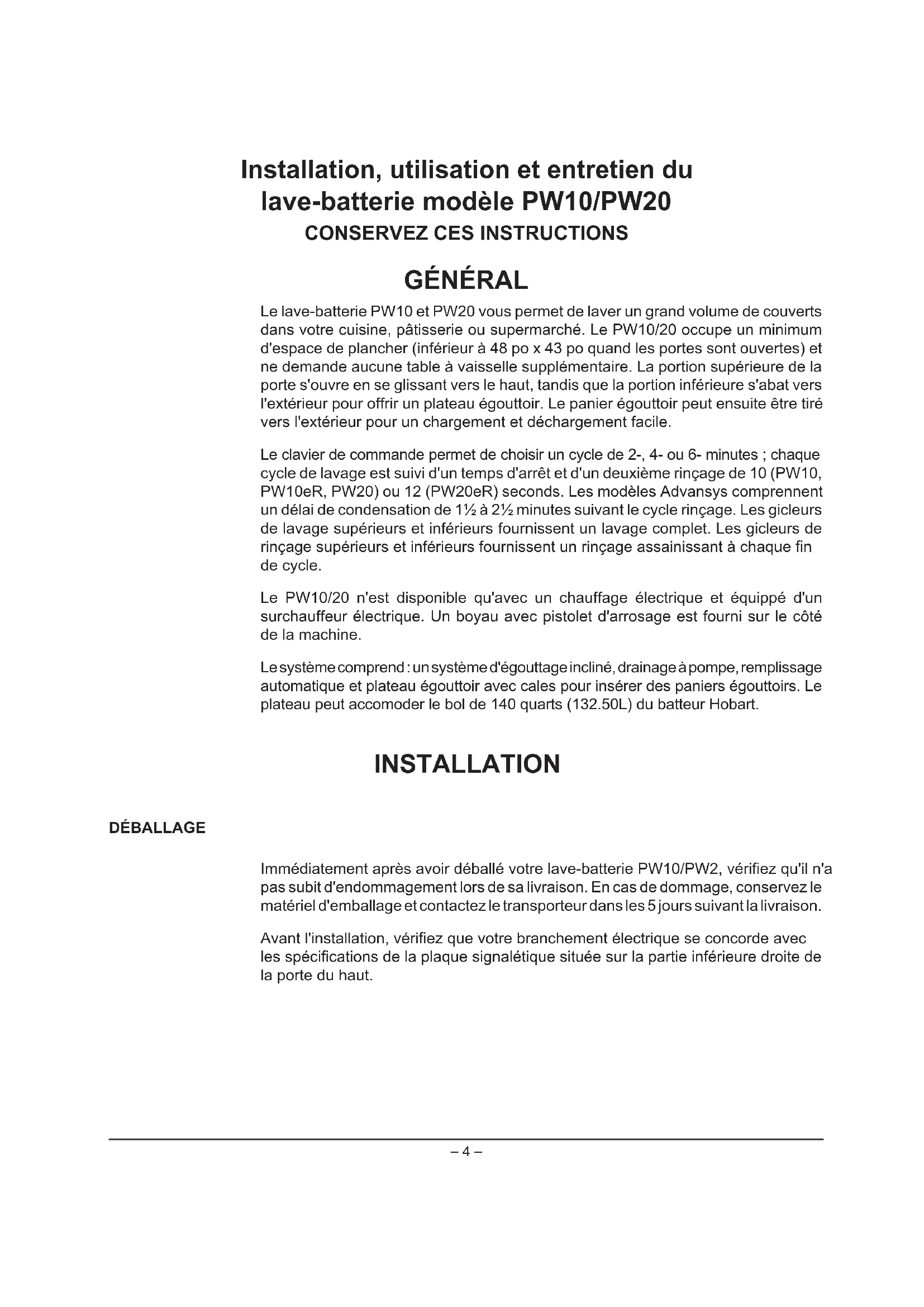 Le lave-batterie PW10 et PW20 vous permet de laver un grand volume de couverts dans votre cuisine, pâtisserie ou supermarché. Le PW10/20 occupe un minimum d'espace de plancher (inférieur à 48 po x 43 po quand les portes sont ouvertes) et ne demande aucune table à vaisselle supplémentaire. La portion supérieure de la porte s'ouvre en se glissant vers le haut, tandis que la portion inférieure s'abat vers l'extérieur pour offrir un plateau égouttoir. Le panier égouttoir peut ensuite être tiré vers l'extérieur pour un chargement et déchargement facile. Le clavier de commande permet de choisir un cycle de 2-, 4- ou 6- minutes ; chaque cycle de lavage est suivi d'un temps d'arrêt et d'un deuxième rinçage de 10 (PW10, PW10eR, PW20) ou 12 (PW20eR) seconds. Les modèles Advansys comprennent un délai de condensation de 1½ à 2½ minutes suivant le cycle rinçage. Les gicleurs de lavage supérieurs et inférieurs fournissent un lavage complet. Les gicleurs de rinçage supérieurs et inférieurs fournissent un rinçage assainissant à chaque n de cycle. Le PW10/20 n'est disponible qu'avec un chauffage électrique et équippé d'un surchauffeur électrique. Un boyau avec pistolet d'arrosage est fourni sur le côté de la machine. Le système comprend : un système d'égouttage incliné, drainage à pompe, remplissage automatique et plateau égouttoir avec cales pour insérer des paniers égouttoirs. Le plateau peut accomoder le bol de 140 quarts (132.50L) du batteur Hobart. INSTALLATION DÉBALLAGE Immédiatement après avoir déballé votre lave-batterie PW10/PW2, vériez qu'il n'a pas subit d'endommagement lors de sa livraison. En cas de dommage, conservez le matériel d'emballage et contactez le transporteur dans les 5 jours suivant la livraison. Avant l'installation, vériez que votre branchement électrique se concorde avec les spécications de la plaque signalétique située sur la partie inférieure droite de la porte du haut.– 5 – Retirer la machine de la palette Retirez soigneusement la machine de la palette :