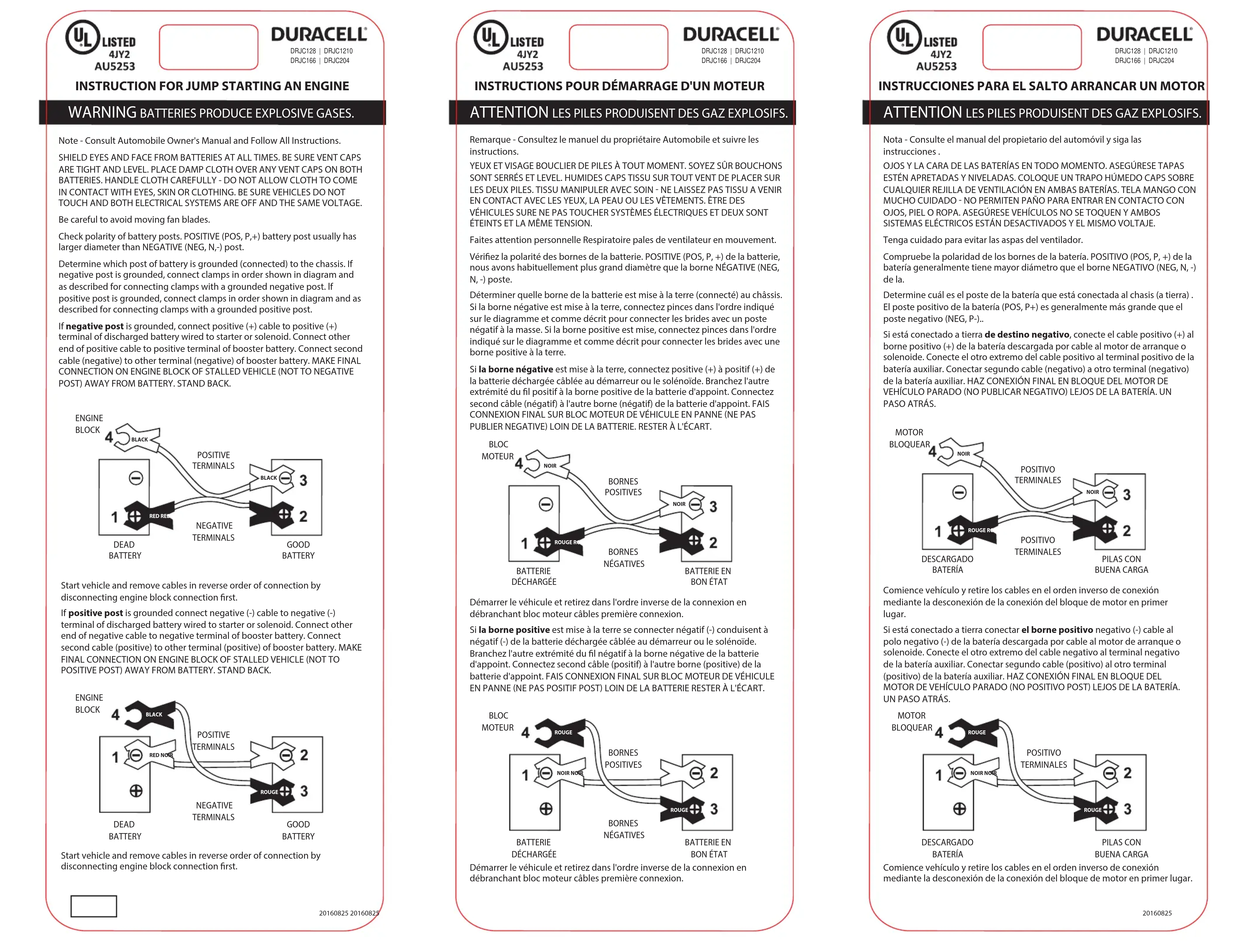 ATTENTION LES PILES PRODUISENT DES GAZ EXPLOSIFS. Remarque - Consultez le manuel du propriétaire Automobile et suivre les instructions. YEUX ET VISAGE BOUCLIER DE PILES À TOUT MOMENT. SOYEZ SÛR BOUCHONS SONT SERRÉS ET LEVEL. HUMIDES CAPS TISSU SUR TOUT VENT DE PLACER SUR LES DEUX PILES. TISSU MANIPULER AVEC SOIN NE LAISSEZ PAS TISSU A VENIR EN CONTACT AVEC LES YEUX, LA PEAU OU LES VÊTEMENTS. ÊTRE DES VÉHICULES SURE NE PAS TOUCHER SYSTÈMES ÉLECTRIQUES ET DEUX SONT ÉTEINTS ET LA MÊME TENSION. Faites attention personnelle Respiratoire pales de ventilateur en mouvement. Vériez la polarité des bornes de la batterie. POSITIVE (POS, P, +) de la batterie, nous avons habituellement plus grand diamètre que la borne NÉGATIVE (NEG, N, -) poste. Déterminer quelle borne de la batterie est mise à la terre (connecté) au châssis. Si la borne négative est mise à la terre, connectez pinces dans l'ordre indiqué sur le diagramme et comme décrit pour connecter les brides avec un poste négatif à la masse. Si la borne positive est mise, connectez pinces dans l'ordre indiqué sur le diagramme et comme décrit pour connecter les brides avec une borne positive à la terre. Si la borne négative est mise à la terre, connectez positive (+) à positif (+) de la batterie déchargée câblée au démarreur ou le solénoïde. Branchez l'autre extrémité du l positif à la borne positive de la batterie d'appoint. Connectez second câble (négatif) à l'autre borne (négatif) de la batterie d'appoint. FAIS CONNEXION FINAL SUR BLOC MOTEUR DE VÉHICULE EN PANNE NE PAS PUBLIER NEGATIVE LOIN DE LA BATTERIE. RESTER À L'ÉCART. Démarrer le véhicule et retirez dans l'ordre inverse de la connexion en débranchant bloc moteur câbles première connexion. Si la borne positive est mise à la terre se connecter négatif (-) conduisent à négatif (-) de la batterie déchargée câblée au démarreur ou le solénoïde. Branchez l'autre extrémité du l négatif à la borne négative de la batterie d'appoint. Connectez second câble (positif) à l'autre borne (positive) de la batterie d'appoint. FAIS CONNEXION FINAL SUR BLOC MOTEUR DE VÉHICULE EN PANNE NE PAS POSITIF POST LOIN DE LA BATTERIE RESTER À L'ÉCART. Démarrer le véhicule et retirez dans l'ordre inverse de la connexion en débranchant bloc moteur câbles première connexion. BATTERIE