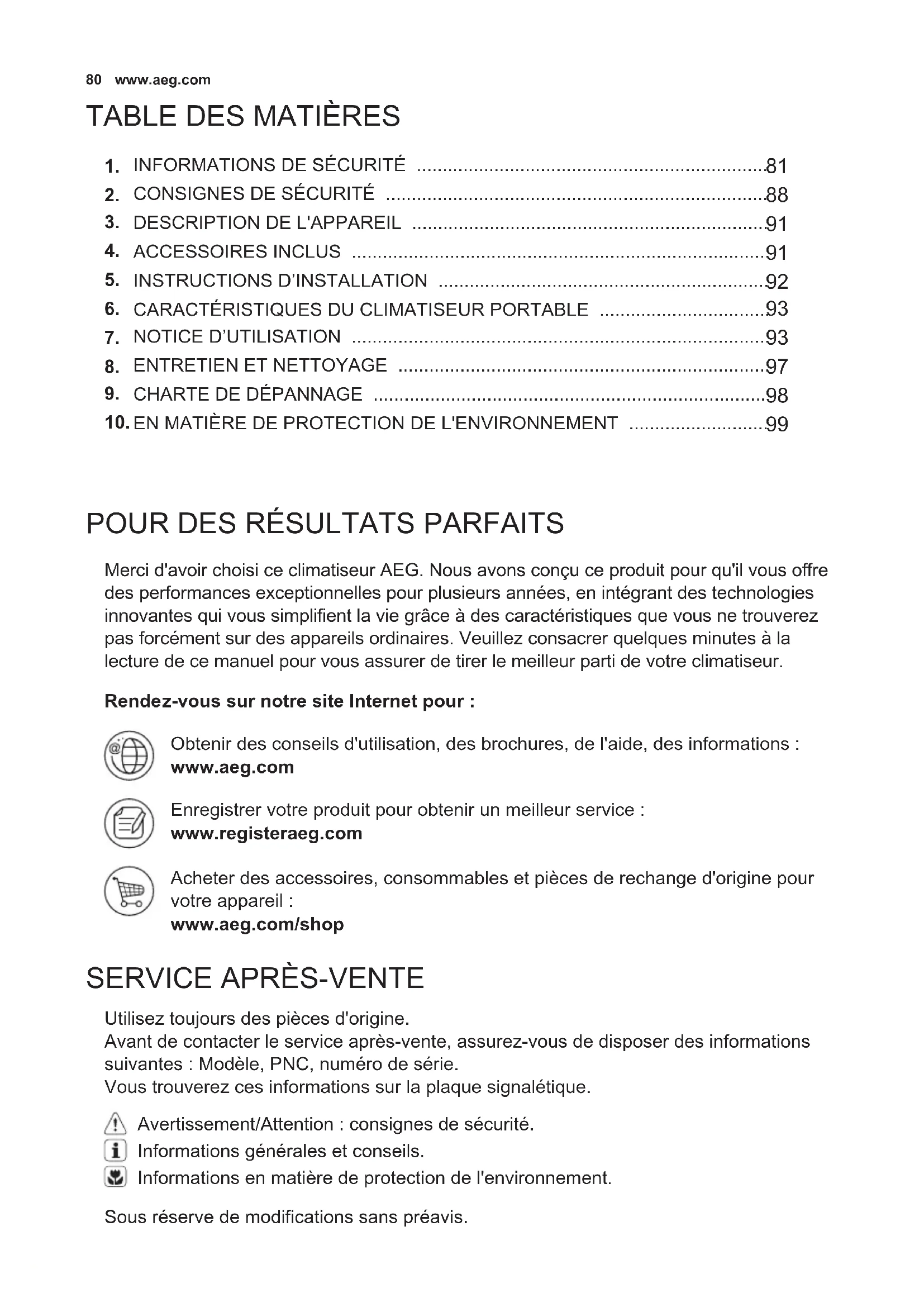 Merci d'avoir choisi ce climatiseur AEG. Nous avons conçu ce produit pour qu'il vous offre des performances exceptionnelles pour plusieurs années, en intégrant des technologies innovantes qui vous simplifient la vie grâce à des caractéristiques que vous ne trouverez pas forcément sur des appareils ordinaires. Veuillez consacrer quelques minutes à la lecture de ce manuel pour vous assurer de tirer le meilleur parti de votre climatiseur. Utilisez toujours des pièces d'origine. Avant de contacter le service après-vente, assurez-vous de disposer des informations suivantes : Modèle, PNC, numéro de série. Vous trouverez ces informations sur la plaque signalétique. Rendez-vous sur notre site Internet pour : Obtenir des conseils d'utilisation, des brochures, de l'aide, des informations : www.aeg.com Enregistrer votre produit pour obtenir un meilleur service : www.registeraeg.com Acheter des accessoires, consommables et pièces de rechange d'origine pour votre appareil : www.aeg.com/shop