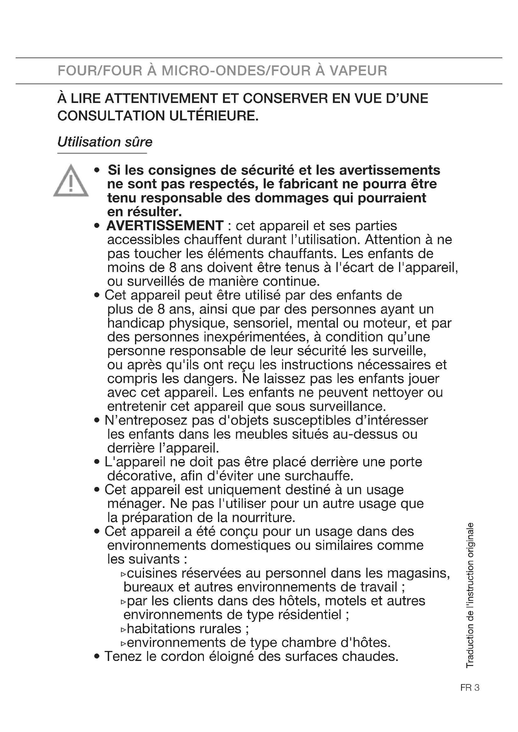 - AVERTISSEMENT: Lorsque l’appareil fonctionne en mode combiné, les enfants ne doivent utiliser l’appareil que sous la surveillance d’un adulte en raison des températures générées. Un four à micro-ondes ne convient pas pour: