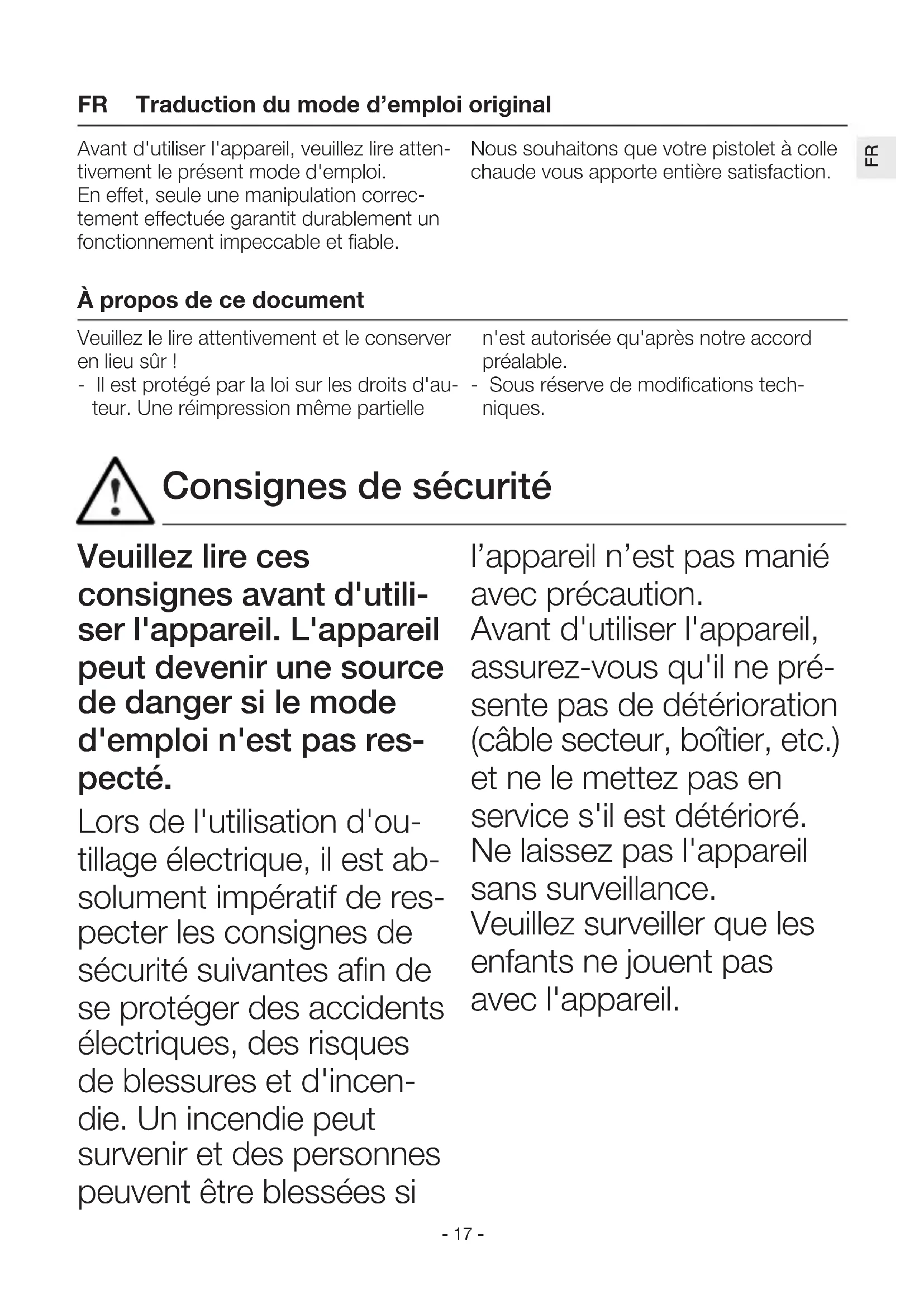Veuillez lire ces consignes avant d'utili- ser l'appareil. L'appareil peut devenir une source de danger si le mode d'emploi n'est pas res- pecté. Lors de l'utilisation d'ou- tillage électrique, il est ab- solument impératif de res- pecter les consignes de sécurité suivantes afin de se protéger des accidents électriques, des risques de blessures et d'incen- die. Un incendie peut survenir et des personnes peuvent être blessées si l’appareil n’est pas manié avec précaution. Avant d'utiliser l'appareil, assurez-vous qu'il ne pré- sente pas de détérioration (câble secteur, boîtier, etc.) et ne le mettez pas en service s'il est détérioré. Ne laissez pas l'appareil sans surveillance. Veuillez surveiller que les enfants ne jouent pas avec l'appareil. Avant d'utiliser l'appareil, veuillez lire atten- tivement le présent mode d'emploi. En effet, seule une manipulation correc- tement effectuée garantit durablement un fonctionnement impeccable et fiable. Nous souhaitons que votre pistolet à colle chaude vous apporte entière satisfaction. Traduction du mode d’emploi original À propos de ce document Veuillez le lire attentivement et le conserver en lieu sûr ! - Il est protégé par la loi sur les droits d'au- teur. Une réimpression même partielle n'est autorisée qu'après notre accord préalable. - Sous réserve de modifications tech- niques. Consignes de sécurité FR- 18 - Tenez compte des conditions ambiantes. N'exposez jamais les appareils électriques à la pluie ou à l'humidité. N'uti- lisez pas l'appareil lorsqu'il est humide, ni dans un environnement humide ou mouillé. N'utilisez pas l'appareil à proximité de matières inflammables et ne le di- rigez pas longtemps vers le même endroit. N'utilisez pas l'appareil en présence d'une atmosphère explo- sive. La chaleur dégagée peut être transmise à des matériaux inflammables cachés. Protégez-vous contre les accidents électriques. Évitez de toucher des éléments mis à la terre comme tuyaux, radiateurs, cuisinières et réfrigérateurs. Ne laissez pas l'appareil sans surveillance tant qu'il fonctionne. Stockez l'appareil dans un endroit sûr. Après utilisation, posez l'appareil sur sa surface d'appui et laissez-le refroi- dir avant de le remballer. Lorsqu'il n'est pas utilisé, l'appareil doit être conser- vé dans un local fermé à l'abri de l'humidité et hors de portée des enfants. Les enfants de 8 ans et plus ainsi que les per- sonnes dont les capacités physiques, sensorielles ou mentales sont réduites ou qui manquent d'expé- rience et de connaissance peuvent utiliser cet ap- pareil s'ils sont surveillés ou s'ils ont été instruits en matière d'utilisation en Consignes de sécurité- 19 -