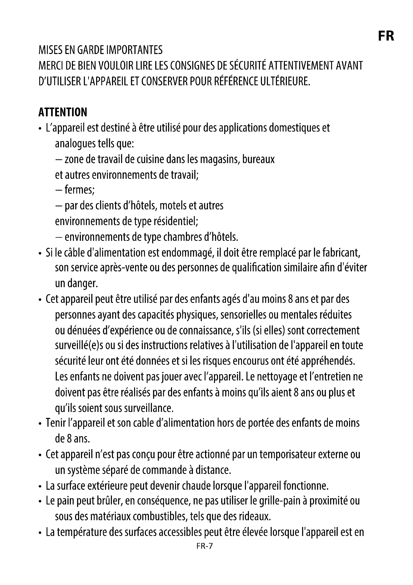 - Ne jamais insérer de tranches de pain trop épaisses dans le grille-pain car cela pourrait bloquer le mécanisme de remontée et provoquer un incendie.