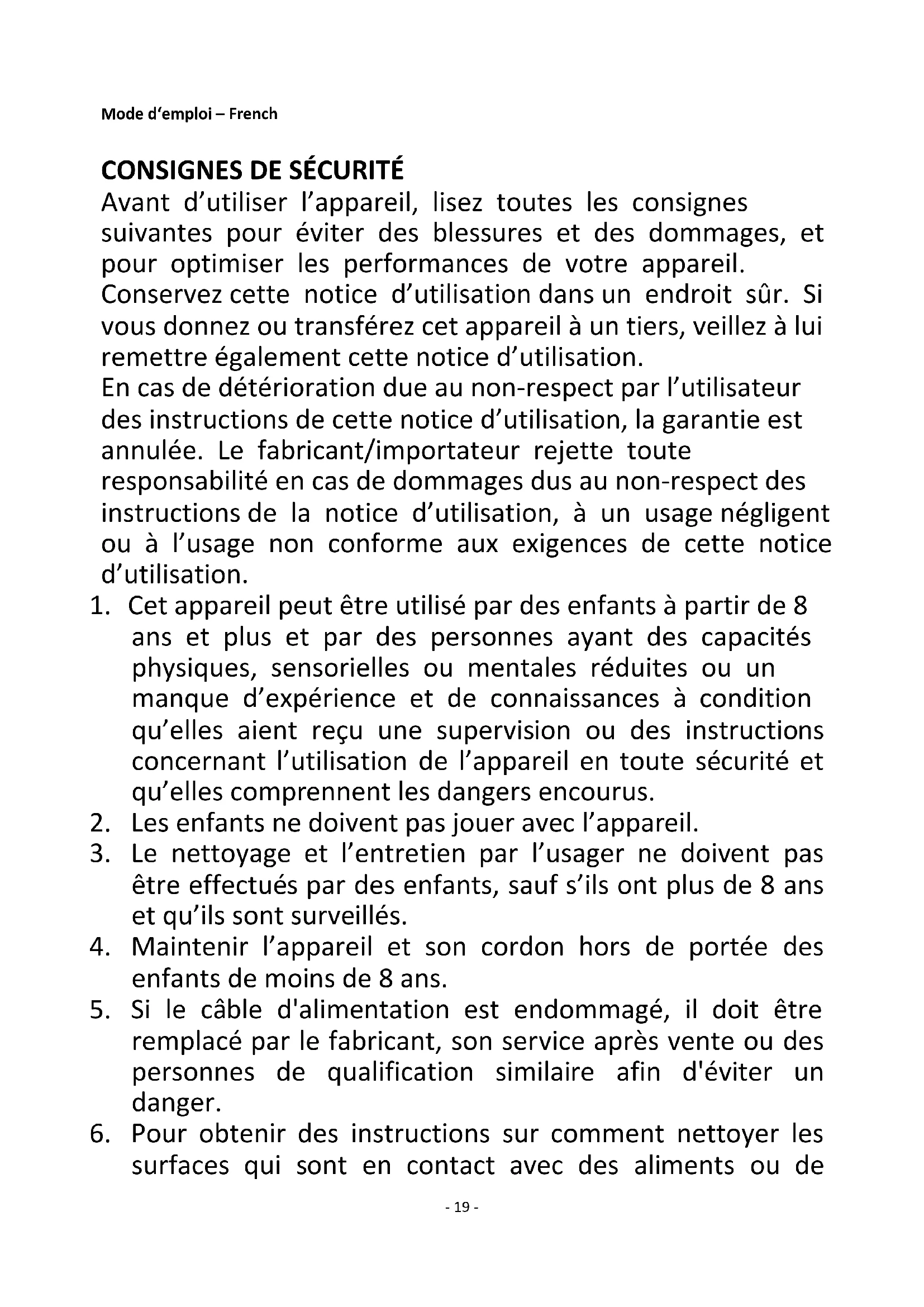 Avant d’utiliser l’appareil, lisez toutes les consignes suivantes pour éviter des blessures et des dommages, et pour optimiser les performances de votre appareil. Conservez cette notice d’utilisation dans un endroit sûr. Si vous donnez ou transférez cet appareil à un tiers, veillez à lui remettre également cette notice d’utilisation. En cas de détérioration due au non-respect par l’utilisateur des instructions de cette notice d’utilisation, la garantie est annulée. Le fabricant/importateur rejette toute responsabilité en cas de dommages dus au non-respect des instructions de la notice d’utilisation, à un usage négligent ou à l’usage non conforme aux exigences de cette notice d’utilisation.