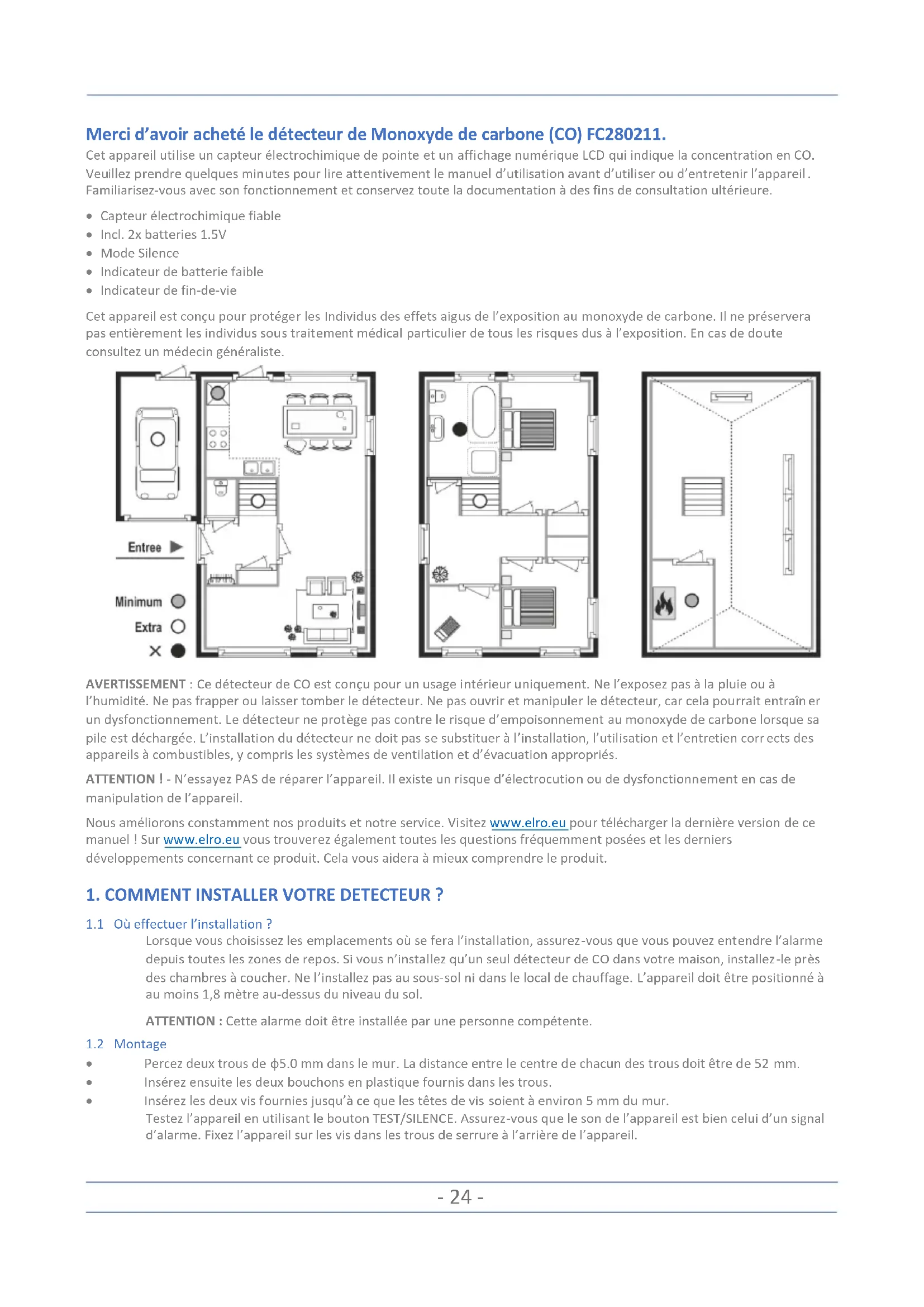 l’humidité. Ne pas frapper ou laisser tomber le détecteur. Ne pas ouvrir et manipuler le détecteur, car cela pourrait entraîner un dysfonctionnement. Le détecteur ne protège pas contre le risque d’empoisonnement au monoxyde de carbone lorsque sa pile est déchargée. L’installation du détecteur ne doit pas se substituer à l’installation, l’utilisation et l’entretien corrects des appareils à combustibles, y compris les systèmes de ventilation et d’évacuation appropriés. ATTENTION ! - N’essayez PAS de réparer l’appareil. Il existe un risque d’électrocution ou de dysfonctionnement en cas de manipulation de l’appareil. Nous améliorons constamment nos produits et notre service. Visitez www.elro.eu pour télécharger la dernière version de ce manuel ! Sur www.elro.eu vous trouverez également toutes les questions fréquemment posées et les derniers développements concernant ce produit. Cela vous aidera à mieux comprendre le produit.