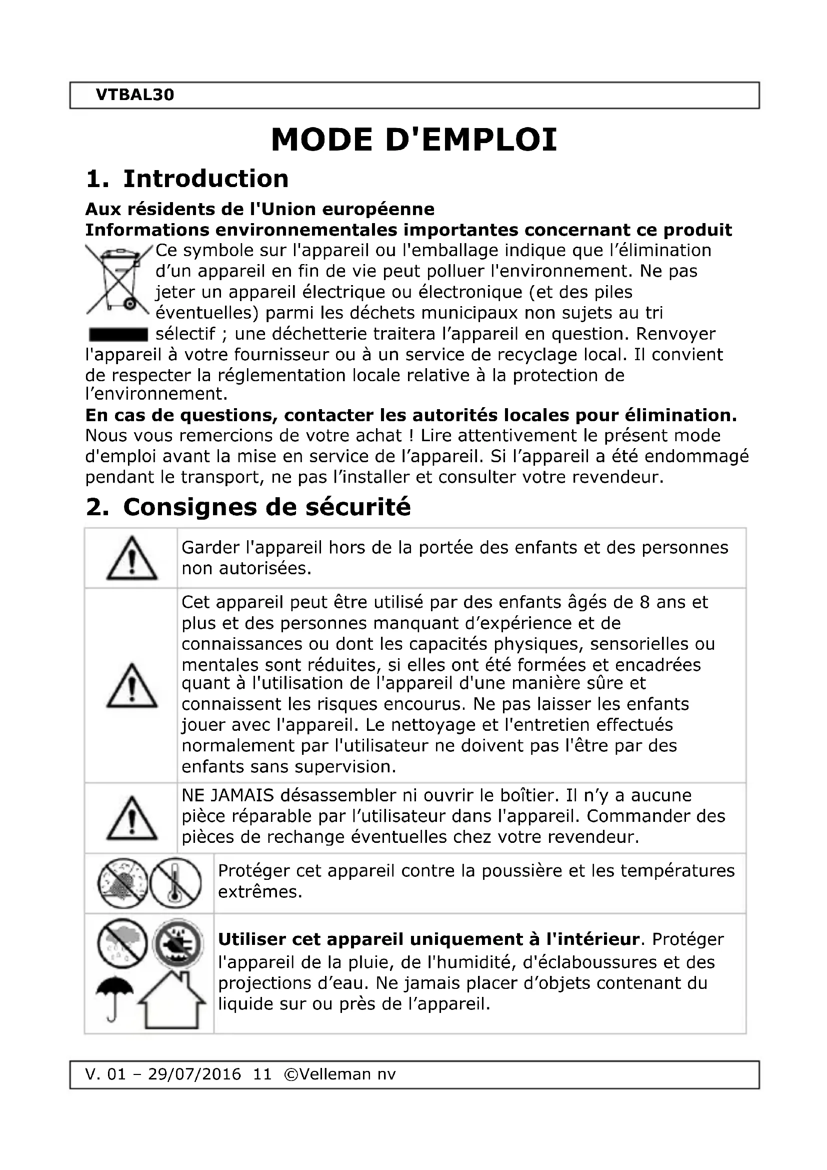 VTBAL30 - équipements de mesure VELLEMAN - Notice d'utilisation et mode d'emploi gratuit