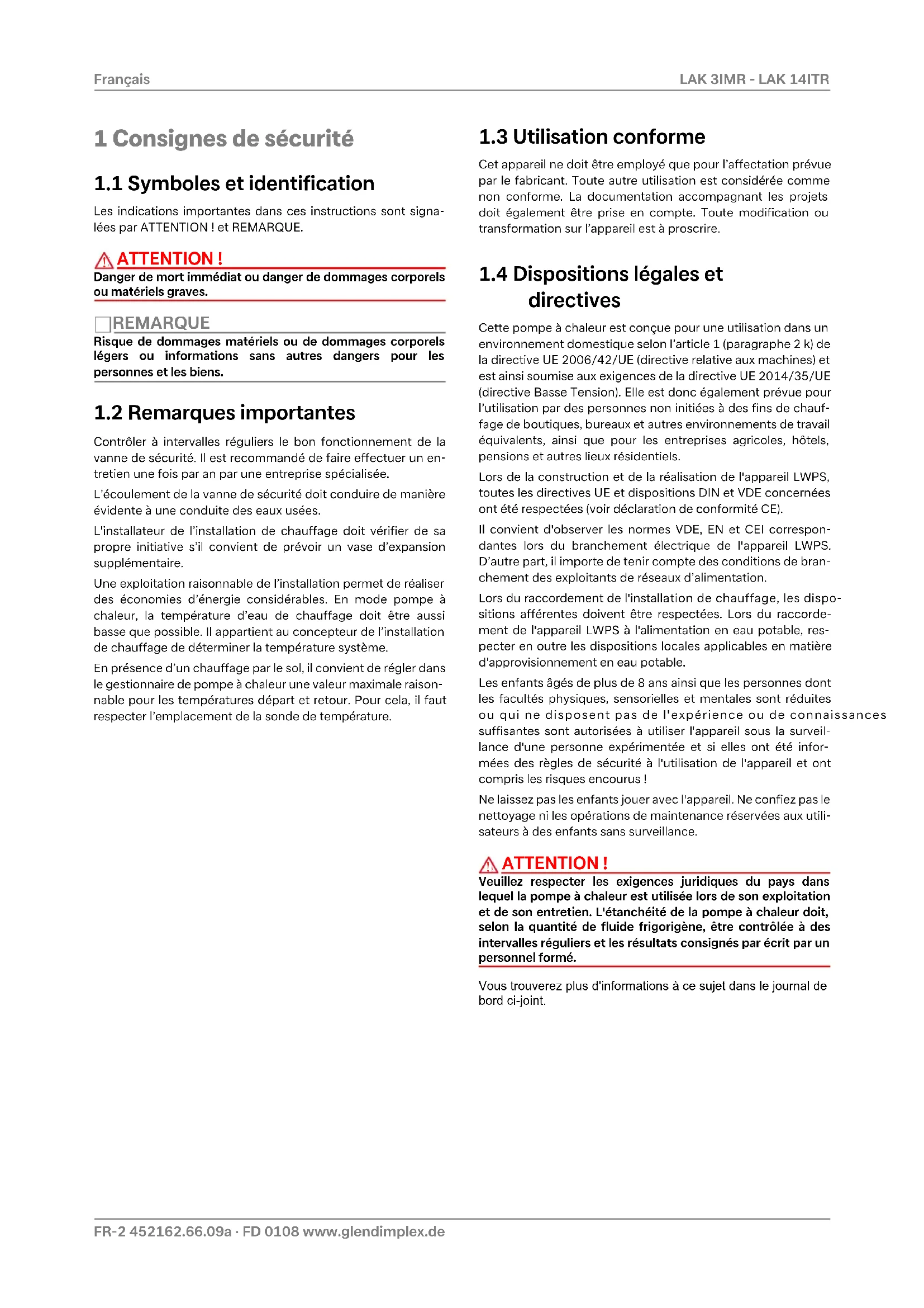 Pompe à chaleur eau glycolée-eau (*) Pour les dispositifs de chauffage des locaux par pompe à chaleur et les dispositifs de chauffage mixtes par pompe à chaleur, la puissance thermique nominale Prated est égale à la charge calorifique nominale Pdesignh et la puissance thermique nominale d’un dispositif de chauffage d’appoint Psup est égale à la puissance calorifique d’appoint sup(Tj ). non Pompes à chaleur basse température: Glen Dimplex Deutschland GmbH, Am Goldenen Feld 18, 95326 Kulmbach oui Pour les pompes à chaleur air-eau: débit d’air nominal, à l’extérieur Pour les pompes à chaleur eau-eau ou eau glycolée-eau: débit nominal d’eau glycolée ou d’eau, échangeur thermique extérieur Dispositif de chauffage mixte par pompe à chaleur: non Les paramètres sont déclarés pour l’application à moyenne température, excepté pour les pompes à chaleur basse température. Pour les pompes à chaleur basse température, les paramètres sont déclarés pour l’application à basse température. Puissance thermique nominale (*) Prated %FR-24 452162.66.09a · FD 0108 www.glendimplex.de Français LAK 3IMR - LAK 14ITR