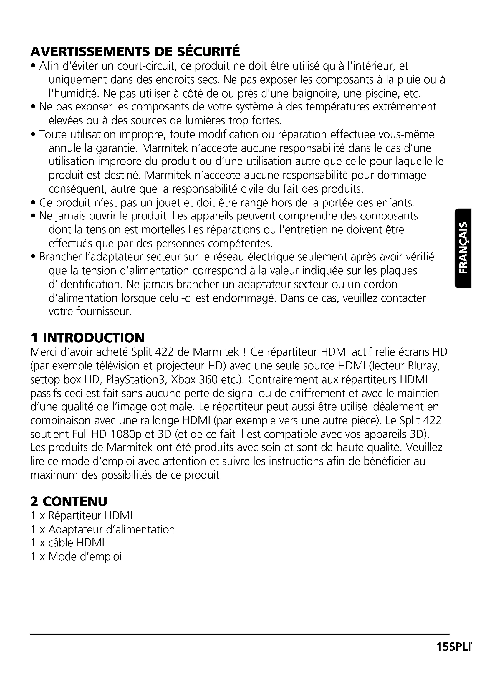 - Brancher l’adaptateur secteur sur le réseau électrique seulement après avoir vérifié que la tension d’alimentation correspond à la valeur indiquée sur les plaques d’identification. Ne jamais brancher un adaptateur secteur ou un cordon d’alimentation lorsque celui-ci est endommagé. Dans ce cas, veuillez contacter votre fournisseur. 1 INTRODUCTION Merci d’avoir acheté Split 422 de Marmitek ! Ce répartiteur HDMI actif relie écrans HD (par exemple télévision et projecteur HD) avec une seule source HDMI (lecteur Bluray, settop box HD, PlayStation3, Xbox 360 etc.). Contrairement aux répartiteurs HDMI passifs ceci est fait sans aucune perte de signal ou de chiffrement et avec le maintien d’une qualité de l’image optimale. Le répartiteur peut aussi être utilisé idéalement en combinaison avec une rallonge HDMI (par exemple vers une autre pièce). Le Split 422 soutient Full HD 1080p et 3D (et de ce fait il est compatible avec vos appareils 3D). Les produits de Marmitek ont été produits avec soin et sont de haute qualité. Veuillez lire ce mode d’emploi avec attention et suivre les instructions afin de bénéficier au maximum des possibilités de ce produit. 2 CONTENU 1 x Répartiteur HDMI 1 x Adaptateur d’alimentation 1 x câble HDMI 1 x Mode d’emploi 15SPLIT 422