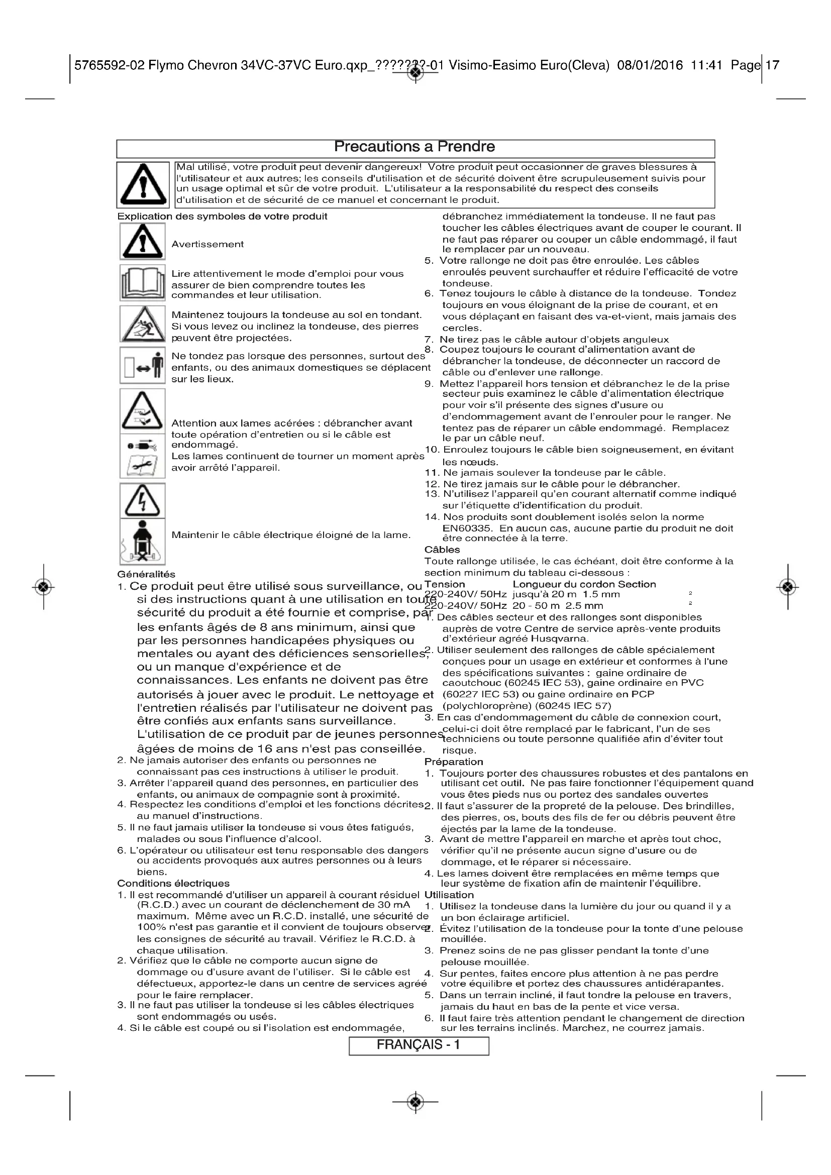 ergestellt oder zugelassen wurden. Dasselbe trifft für modifizierte Maschinen zu. 5765592-02 Flymo Chevron 34VC-37VC Euro.qxp_???????-01 Visimo-Easimo Euro(Cleva) 08/01/2016 11:41 Page 16Precautions a Prendre Mal utilisé, votre produit peut devenir dangereux! Votre produit peut occasionner de graves blessures à l'utilisateur et aux autres; les conseils d'utilisation et de sécurité doivent être scrupuleusement suivis pour un usage optimal et sûr de votre produit. L'utilisateur a la responsabilité du respect des conseils d'utilisation et de sécurité de ce manuel et concernant le produit. Explication des symboles de votre produit Avertissement Lire attentivement le mode d’emploi pour vous assurer de bien comprendre toutes les commandes et leur utilisation. Maintenez toujours la tondeuse au sol en tondant. Si vous levez ou inclinez la tondeuse, des pierres