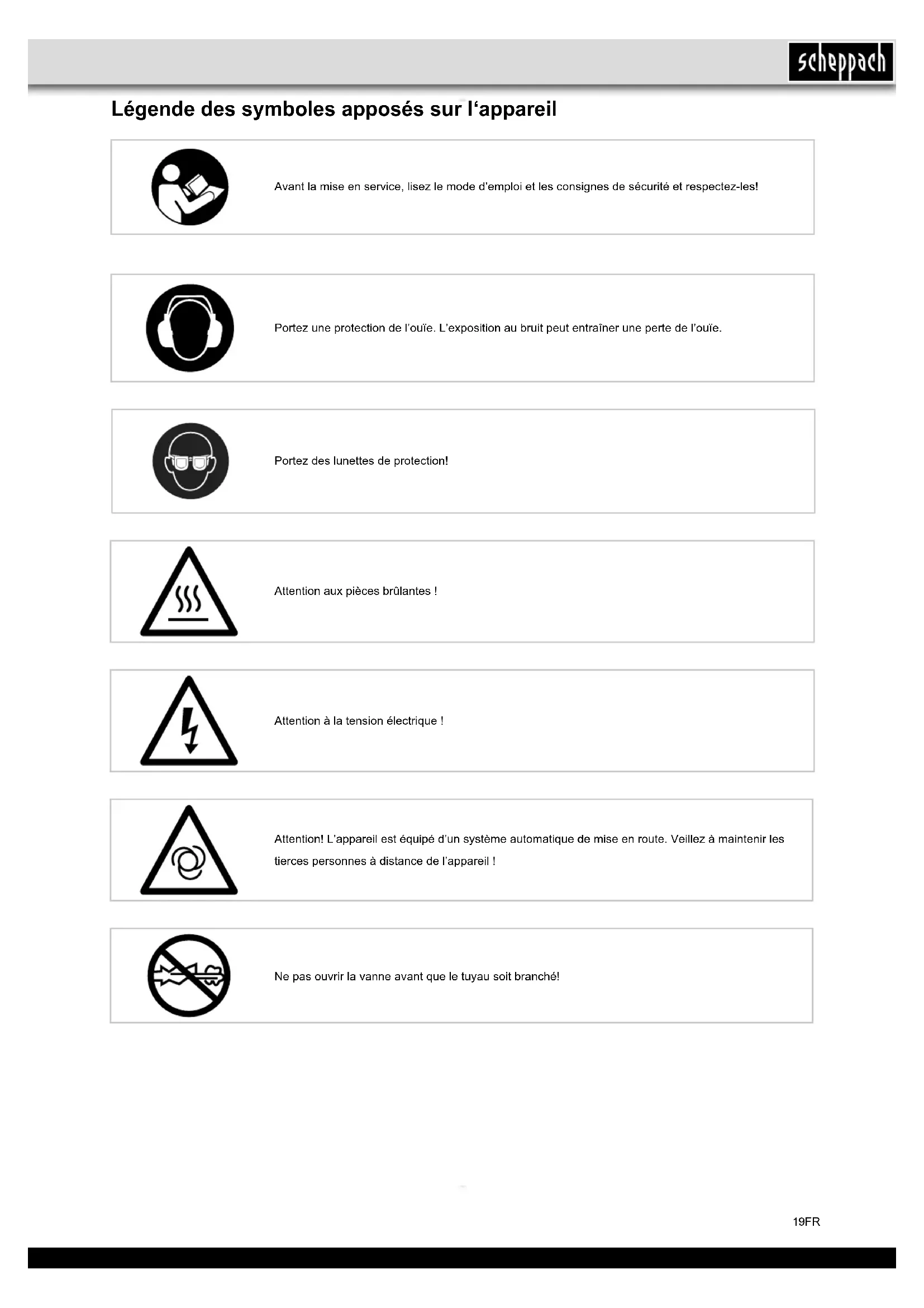 - A quick-lock coupling has a leak.19FR Légende des symboles apposés sur l‘appareil Avant la mise en service, lisez le mode d’emploi et les consignes de sécurité et respectez-les! Attention à la tension électrique ! Attention! L’appareil est équipé d’un système automatique de mise en route. Veillez à maintenir les tierces personnes à distance de l’appareil ! Portez une protection de l’ouïe. L’exposition au bruit peut entraîner une perte de l’ouïe. Attention aux pièces brûlantes ! Portez des lunettes de protection! Ne pas ouvrir la vanne avant que le tuyau soit branché!20 FR Description de l’appareil
