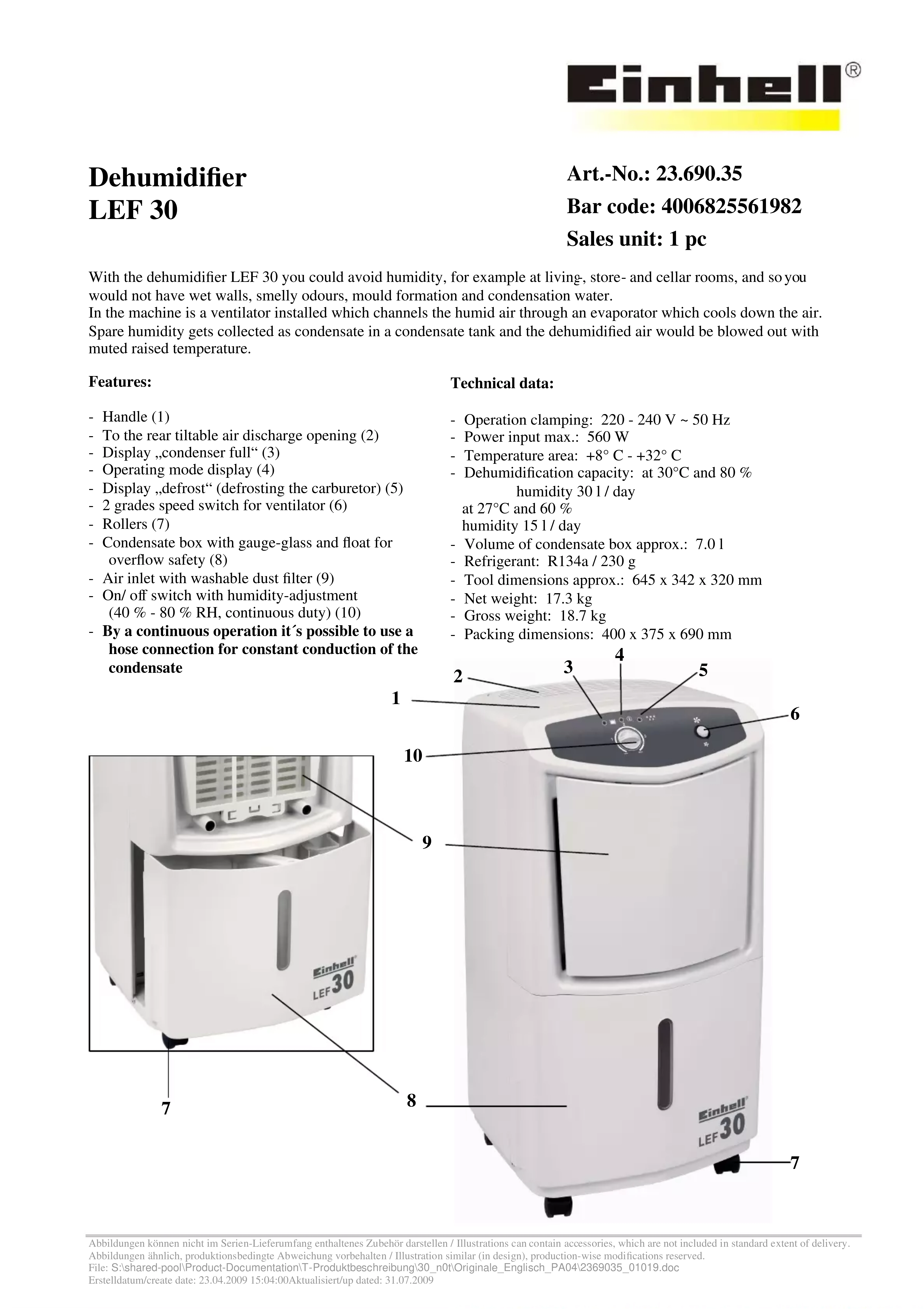 LEF 30 - Déshumidificateur EINHELL - Notice d'utilisation et mode d'emploi gratuit