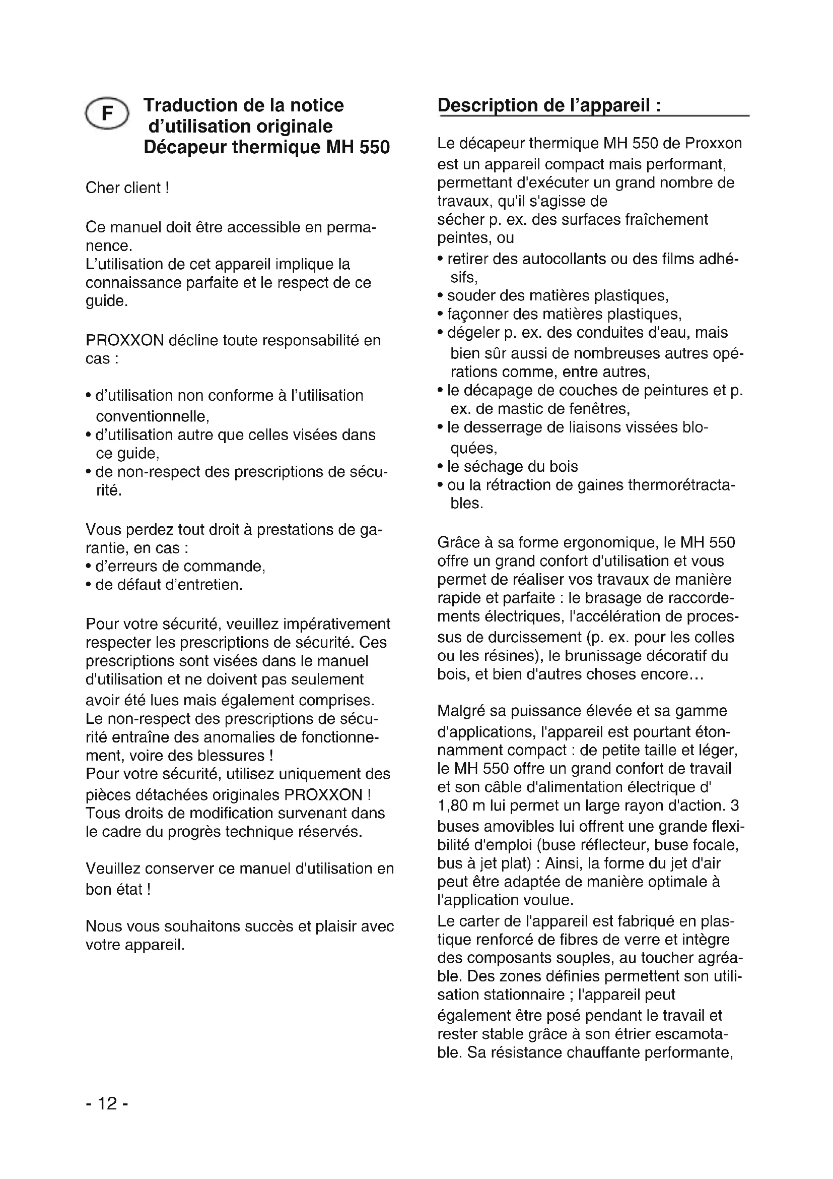 - de défaut d’entretien. Pour votre sécurité, veuillez impérativement respecter les prescriptions de sécurité. Ces prescriptions sont visées dans le manuel d'utilisation et ne doivent pas seulement avoir été lues mais également comprises. Le non-respect des prescriptions de sécu- rité entraîne des anomalies de fonctionne- ment, voire des blessures ! Pour votre sécurité, utilisez uniquement des pièces détachées originales PROXXON ! Tous droits de modification survenant dans le cadre du progrès technique réservés. Veuillez conserver ce manuel d'utilisation en bon état ! Nous vous souhaitons succès et plaisir avec votre appareil. Description de l’appareil : Le décapeur thermique MH 550 de Proxxon est un appareil compact mais performant, permettant d'exécuter un grand nombre de travaux, qu'il s'agisse de sécher p. ex. des surfaces fraîchement peintes, ou