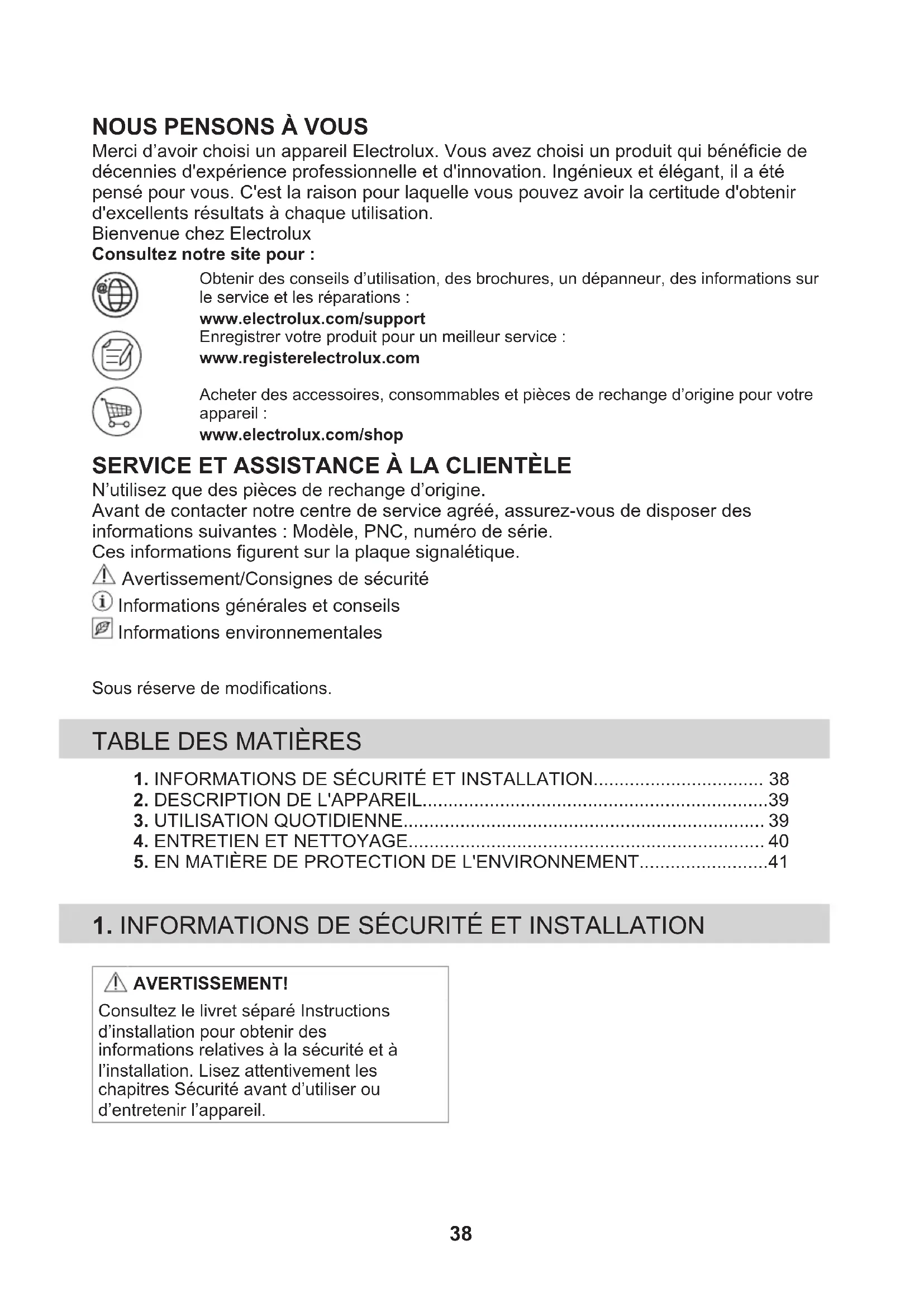 Merci d’avoir choisi un appareil Electrolux. Vous avez choisi un produit qui bénéficie de décennies d'expérience professionnelle et d'innovation. Ingénieux et élégant, il a été pensé pour vous. C'est la raison pour laquelle vous pouvez avoir la certitude d'obtenir d'excellents résultats à chaque utilisation. Bienvenue chez Electrolux Consultez notre site pour : Obtenir des conseils d’utilisation, des brochures, un dépanneur, des informations surle service et les réparations :www.electrolux.com/supportEnregistrer votre produit pour un meilleur service :www.registerelectrolux.comAcheter des accessoires, consommables et pièces de rechange d’origine pour votreappareil :www.electrolux.com/shop