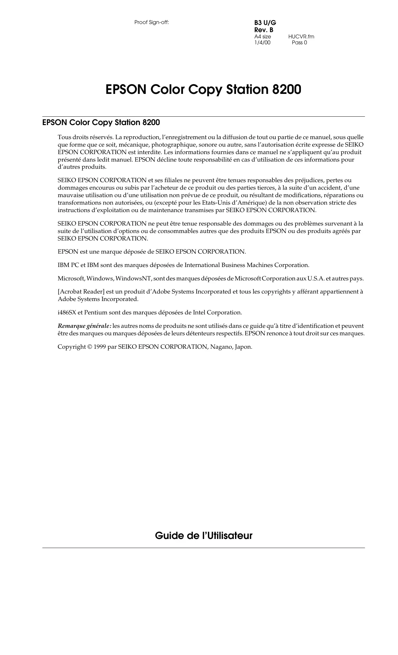 - Proof Sign-off: B3 U/G Rev. B A4 size 1/4/00 HUCVR.fm Pass 0 EPSON Color Copy Station 8200 EPSON Color Copy Station 8200 Tous droits réservés. La reproduction, l’enregistrement ou la diffusion de tout ou partie de ce manuel, sous quelle que forme que ce soit, mécanique, photographique, sonore ou autre, sans l’autorisation écrite expresse de SEIKO EPSON CORPORATION est interdite. Les informations fournies dans ce manuel ne s’appliquent qu’au produit présenté dans ledit manuel. EPSON décline toute responsabilité en cas d’utilisation de ces informations pour d’autres produits. SEIKO EPSON CORPORATION et ses filiales ne peuvent être tenues responsables des préjudices, pertes ou dommages encourus ou subis par l’acheteur de ce produit ou des parties tierces, à la suite d’un accident, d’une mauvaise utilisation ou d’une utilisation non prévue de ce produit, ou résultant de modifications, réparations ou transformations non autorisées, ou (excepté pour les Etats-Unis d’Amérique) de la non observation stricte des instructions d’exploitation ou de maintenance transmises par SEIKO EPSON CORPORATION. SEIKO EPSON CORPORATION ne peut être tenue responsable des dommages ou des problèmes survenant à la suite de l’utilisation d’options ou de consommables autres que des produits EPSON ou des produits agréés par SEIKO EPSON CORPORATION. EPSON est une marque déposée de SEIKO EPSON CORPORATION. IBM PC et IBM sont des marques déposées de International Business Machines Corporation. Microsoft, Windows, WindowsNT, sont des marques déposées de Microsoft Corporation aux U.S.A. et autres pays. [Acrobat Reader] est un produit d’Adobe Systems Incorporated et tous les copyrights y afférant appartiennent à Adobe Systems Incorporated. i486SX et Pentium sont des marques déposées de Intel Corporation. Remarque générale: les autres noms de produits ne sont utilisés dans ce guide qu’à titre d’identification et peuvent être des marques ou marques déposées de leurs détenteurs respectifs. EPSON renonce à tout droit sur ces marques. Copyright © 1999 par SEIKO EPSON CORPORATION, Nagano, Japon. Guide de l’Utilisateur B3 Net U/G Rev. B Proof Sign-off: A4 size 1/4/00 UG.toc Pass 0 Sommaire EPSON Color Copy Station 8200 EPSON Color Copy Station 8200