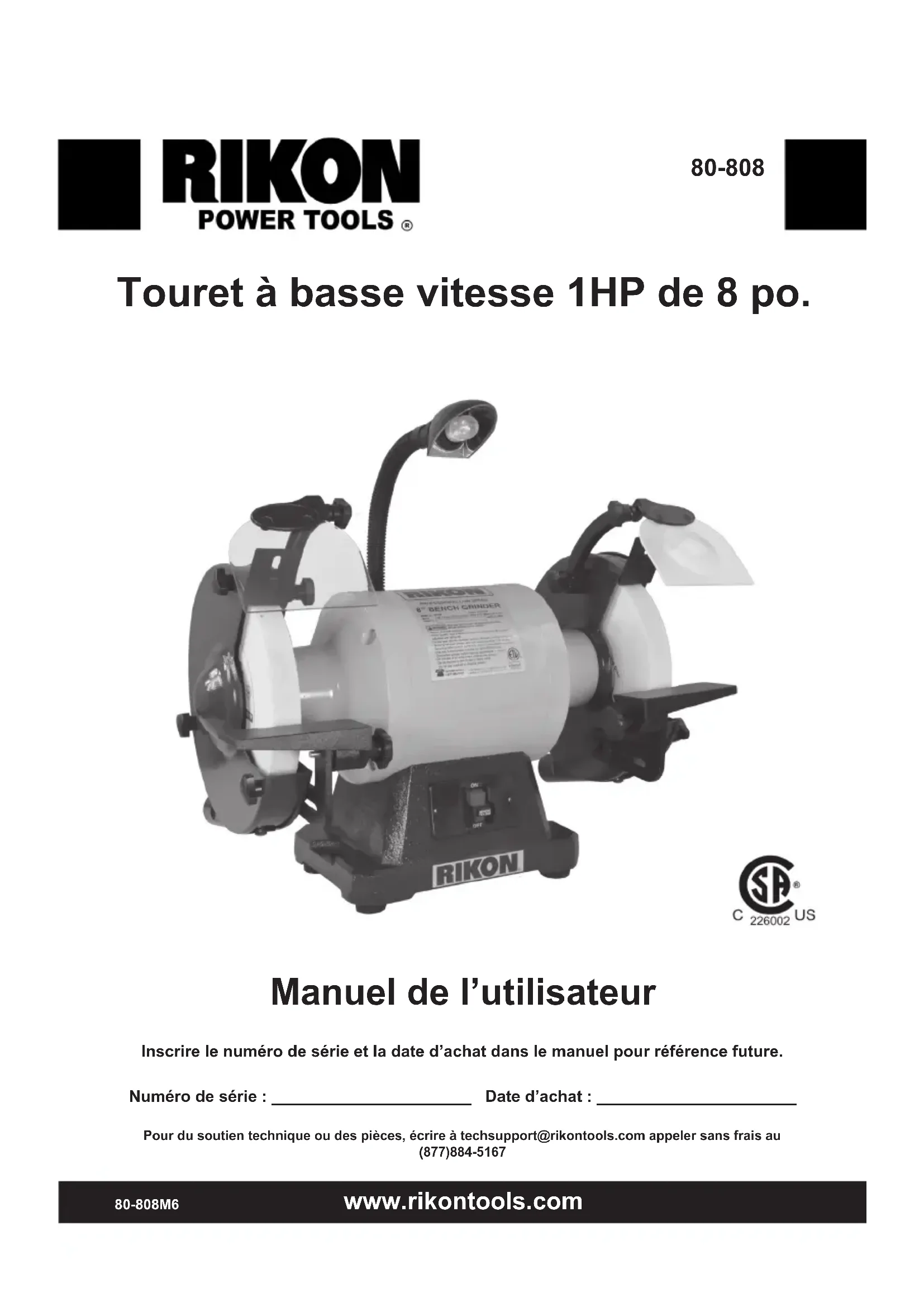 - Touret à basse vitesse 1HP de 8 po. 80-808 www.rikontools.com 80-808M6 Manuel de l’utilisateur Inscrire le numéro de série et la date d’achat dans le manuel pour référence future. Numéro de série : ______________________ Date d’achat : ______________________ Pour du soutien technique ou des pièces, écrire à techsupport@rikontools.com appeler sans frais au (877)884-5167TABLE DES MATIÈRES Consignes de sécurité p. 3