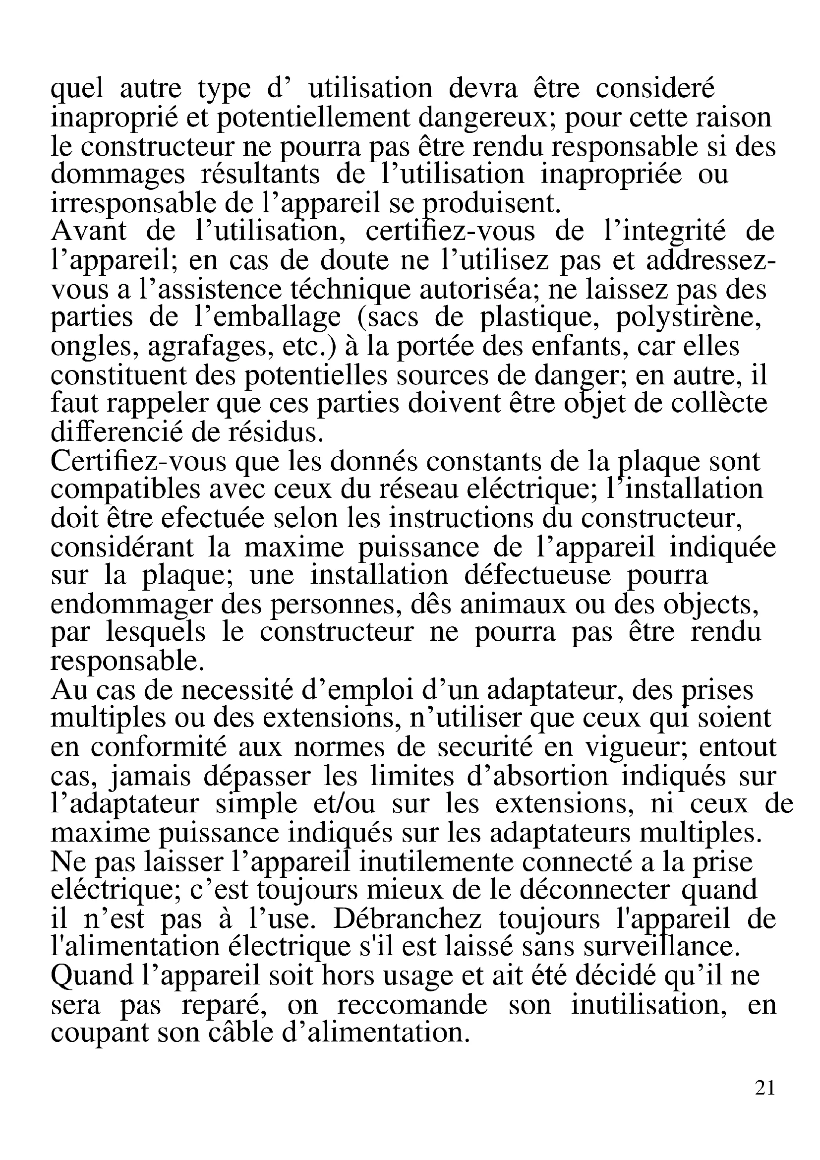 Les indications suivantes sont très importantes en ce qui concerne l’installation, usage et manutention de cet appareil; gardez soigneusement ce manuel pour des futures consultations; n’utilisez pas l’appareil que selon les indications de ce manuel d’instructions; n’importe21 quel autre type d’ utilisation devra être consideré inaproprié et potentiellement dangereux; pour cette raison le constructeur ne pourra pas être rendu responsable si des dommages résultants de l’utilisation inapropriée ou irresponsable de l’appareil se produisent. Avant de l’utilisation, certifiez-vous de l’integrité de l’appareil; en cas de doute ne l’utilisez pas et addressez- vous a l’assistence téchnique autoriséa; ne laissez pas des parties de l’emballage (sacs de plastique, polystirène, ongles, agrafages, etc.) à la portée des enfants, car elles constituent des potentielles sources de danger; en autre, il faut rappeler que ces parties doivent être objet de collècte differencié de résidus. Certifiez-vous que les donnés constants de la plaque sont compatibles avec ceux du réseau eléctrique; l’installation doit être efectuée selon les instructions du constructeur, considérant la maxime puissance de l’appareil indiquée sur la plaque; une installation défectueuse pourra endommager des personnes, dês animaux ou des objects, par lesquels le constructeur ne pourra pas être rendu responsable. Au cas de necessité d’emploi d’un adaptateur, des prises multiples ou des extensions, n’utiliser que ceux qui soient en conformité aux normes de securité en vigueur; entout cas, jamais dépasser les limites d’absortion indiqués sur l’adaptateur simple et/ou sur les extensions, ni ceux de maxime puissance indiqués sur les adaptateurs multiples. Ne pas laisser l’appareil inutilemente connecté a la prise eléctrique; c’est toujours mieux de le déconnecter quand il n’est pas à l’use. Débranchez toujours l'appareil de l'alimentation électrique s'il est laissé sans surveillance. Quand l’appareil soit hors usage et ait été décidé qu’il ne sera pas reparé, on reccomande son inutilisation, en coupant son câble d’alimentation.22 Pour le nettoyage déconnectez la fiche du secteur électrique. - Ne pas approcher le câble d’alimentation d’objects coupants ou de surfaces chaudes, et ne pas tirer sur le cordon d’alimentation pour le débrancher de la prise. Ne le laissez pas pendre du plan de travail où un enfant pourrait le tenir. - Ne pas utiliser l’appareil si le câble d’alimentation ou la fiche de connéction eléctrique sont endommagés, ou encore en cas de court-circuits; dans ce cas là, apporter l’appareil a un centre d’assistence autorisé. - L’appareil n’est pas indiqué pour être exposé à des conditions météorologiques défavorables (pluie, vent, humidité, la glace, etc.); Gardez-le dans un endroit sec. Jamais opérer ou même toucher l’appareil avec les mains mouillées ou les pieds nus. - Cet appareil peut être utilisé par des enfants agés de plus de 8 ans et par des personnes avec une réduite capacité phisique, sensorial ou mental, ou encore avec peu d’expérience à son usage, pourvu qu’une supervision adéquate leur en soit assuré, ou s’ils auraient été instruits à l’usage de l’appareil en complete securité. Les opérations de nettoyage e de manutention ne oivent pás être efectués par des enfants, sauf pour ceux qui sont agés de plus de 8 ans et sont supervisionés. - Les enfants ne doivent pas jouer avec cet appareil. - Gardez l’appareil et le câble d’alimentation hors la portée des enfants agés de moins de 8 ans. Si le câble d'alimentation est endommagé ou en cas de panne et / ou de dysfonctionnement, ne modifiez pas l'appareil. Toute réparation doit être effectuée par le fabricant ou par son service d'assistance technique ou, en tout cas, par une personne possédant une qualification similaire, afin d'éviter tout risque. Le non-respect de ce23 qui précède peut compromettre la sécurité de l'appareil et invalider les conditions de la garantie. ATTENTION: Cet appareil comporte une fonction de chauffage. Quelques surfaces, même si non la plaque elle même, pourront atteindre des températures élevées. Étant donné que la sensibilité à la température diffère de personne à personne, cet appareil devrà être usé avec PRUDENCE. Placez l’appareil sur des surfaces adéhrentes et préparées pour cet effet, et utilisez les mésures de protection contre la chaleur conseillées. - Cet appareil est destiné à être utilisé dans les ménages et des applications similaires: les cuisines du personnel dans les magasins, bureaux et autres environnements de travail, pour les clients dans les hôtels, motels et autres environnements de type résidentiel, de type lit et petit- déjeuner, hébergement. - L’appareil n’est pas conçu pour être utilisé avec une minuterie extérieure ou un commande à distance. - N’utiliser que des accéssoires e pièces d’origine. - Avant chaque utilisation, effectuez le cordon d'alimentation. Ne soumettez pas le produit à des chocs susceptibles de l'endommager.