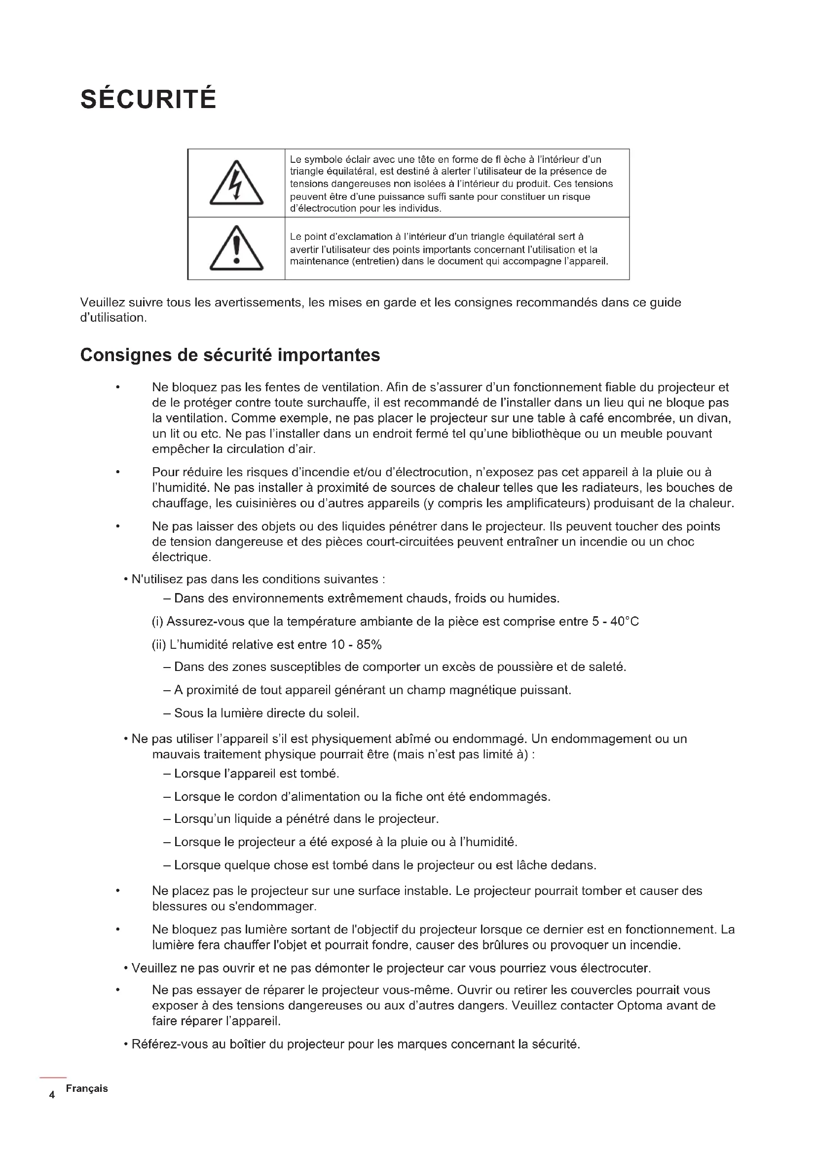 - Ne pas essayer de réparer le projecteur vous-même. Ouvrir ou retirer les couvercles pourrait vous exposer à des tensions dangereuses ou aux d’autres dangers. Veuillez contacter Optoma avant de faire réparer l’appareil.