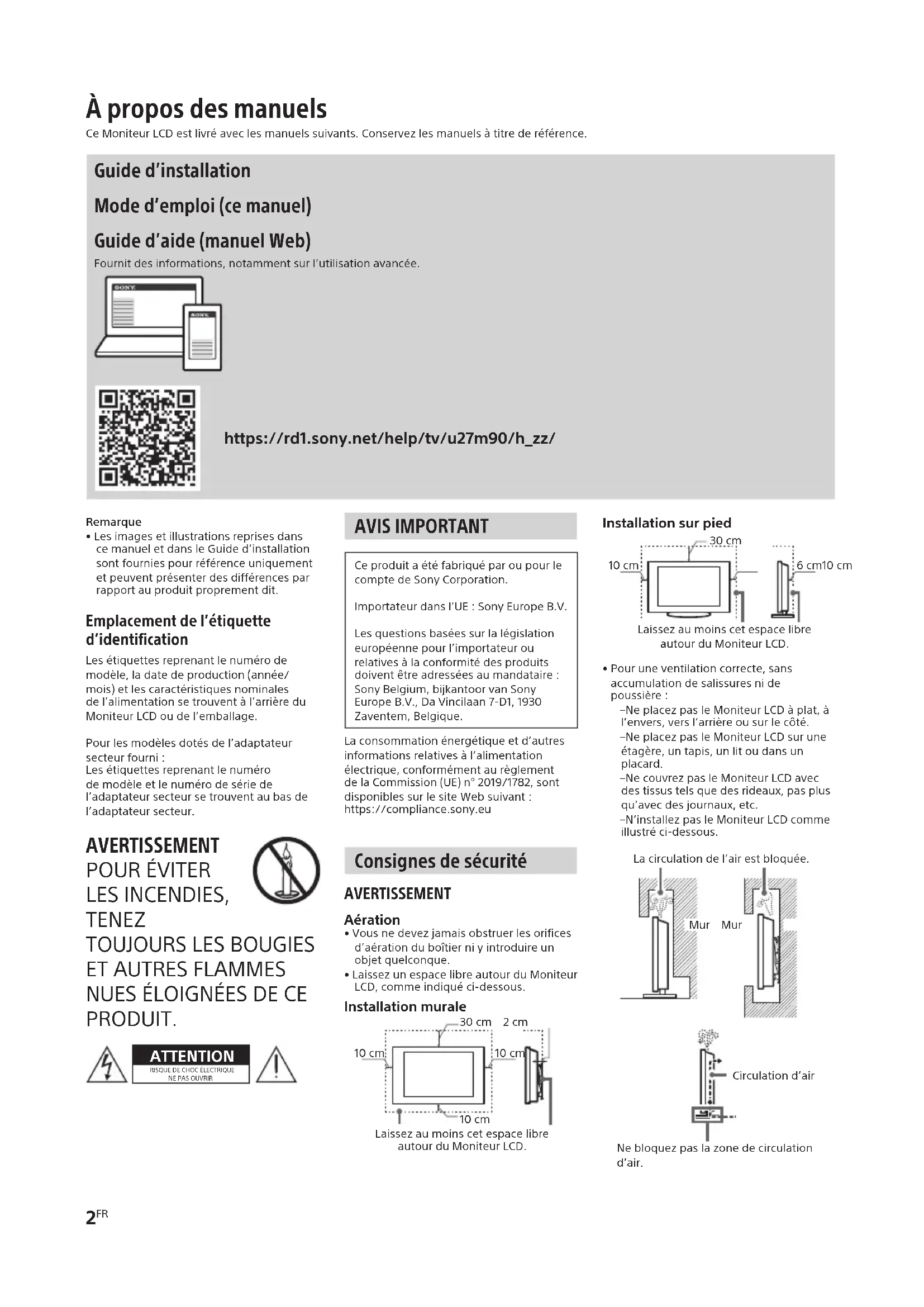 PRODUIT. ATTENTIONRISQUEDECHOCÉLECTRIQUENEPASOUVRIR AVIS IMPORTANT CeproduitaétéfabriquéparoupourlecomptedeSonyCorporation.Importateurdansl’UE:SonyEuropeB.V.Lesquestionsbaséessurlalégislationeuropéennepourl’importateurourelativesàlaconformitédesproduitsdoiventêtreadresséesaumandataire:SonyBelgium,bijkantoorvanSonyEuropeB.V.,DaVincilaan7-D1,1930Zaventem,Belgique.Laconsommationénergétiqueetd’autresinformationsrelativesàl’alimentationélectrique,conformémentaurèglementdelaCommission(UE)n°2019/1782,sontdisponiblessurlesiteWebsuivant:https://compliance.sony.eu Consignes de sécurité AVERTISSEMENT Aération•Vousnedevezjamaisobstruerlesorificesd’aérationduboîtierniyintroduireunobjetquelconque.•LaissezunespacelibreautourduMoniteurLCD,commeindiquéci-dessous.Installation muraleLaissezaumoinscetespacelibreautourduMoniteurLCD.10cm30cm 2cm10cm10cmInstallation sur piedLaissezaumoinscetespacelibreautourduMoniteurLCD.6cm10cm30cm10cm•Pouruneventilationcorrecte,sansaccumulationdesalissuresnidepoussière:– NeplacezpasleMoniteurLCDàplat,àl’envers,versl’arrièreousurlecôté.– NeplacezpasleMoniteurLCDsuruneétagère,untapis,unlitoudansunplacard.– NecouvrezpasleMoniteurLCDavecdestissustelsquedesrideaux,pasplusqu’avecdesjournaux,etc.– N’installezpasleMoniteurLCDcommeillustréci-dessous.Lacirculationdel’airestbloquée.Mur MurCirculationd’airNebloquezpaslazonedecirculationd’air. À propos des manuels CeMoniteurLCDestlivréaveclesmanuelssuivants.Conservezlesmanuelsàtitrederéférence. Guide d’installation Mode d’emploi (ce manuel) Guide d’aide (manuel Web) Fournitdesinformations,notammentsurl’utilisationavancée.https://rd1.sony.net/help/tv/u27m90/h_zz/SDM-U27M90 5-042-069-31(2)