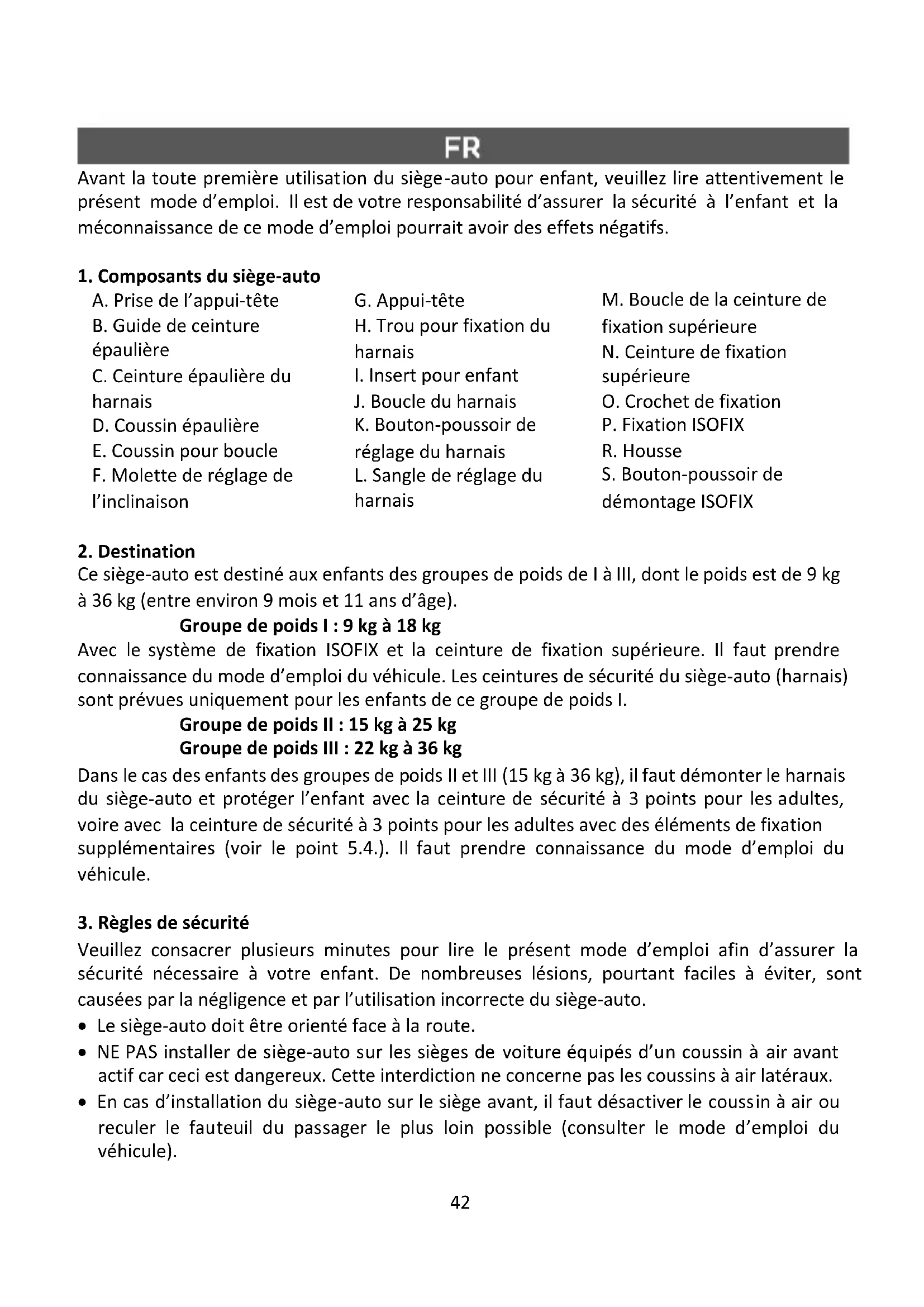 Ce siège-auto est destiné aux enfants des groupes de poids de I à III, dont le poids est de 9 kg à 36 kg (entre environ 9 mois et 11 ans d’âge). Groupe de poids I : 9 kg à 18 kg Avec le système de fixation ISOFIX et la ceinture de fixation supérieure. Il faut prendre connaissance du mode d’emploi du véhicule. Les ceintures de sécurité du siège-auto (harnais) sont prévues uniquement pour les enfants de ce groupe de poids I. Groupe de poids II : 15 kg à 25 kg Groupe de poids III : 22 kg à 36 kg Dans le cas des enfants des groupes de poids II et III (15 kg à 36 kg), il faut démonter le harnais du siège-auto et protéger l’enfant avec la ceinture de sécurité à 3 points pour les adultes, voire avec la ceinture de sécurité à 3 points pour les adultes avec des éléments de fixation supplémentaires (voir le point 5.4.). Il faut prendre connaissance du mode d’emploi du véhicule.