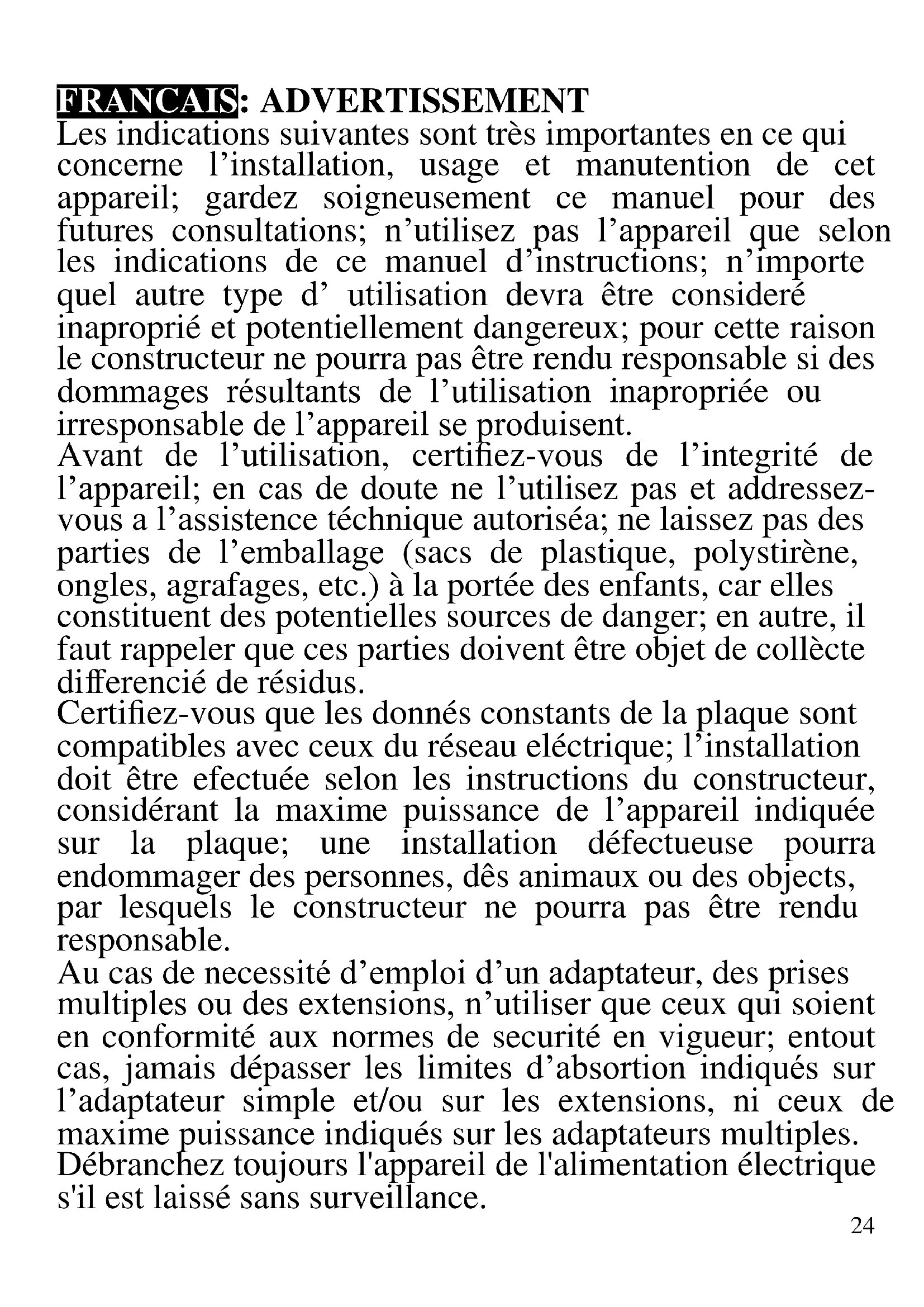 - Krümelschublade24 FRANCAIS: ADVERTISSEMENT Les indications suivantes sont très importantes en ce qui concerne l’installation, usage et manutention de cet appareil; gardez soigneusement ce manuel pour des futures consultations; n’utilisez pas l’appareil que selon les indications de ce manuel d’instructions; n’importe quel autre type d’ utilisation devra être consideré inaproprié et potentiellement dangereux; pour cette raison le constructeur ne pourra pas être rendu responsable si des dommages résultants de l’utilisation inapropriée ou irresponsable de l’appareil se produisent. Avant de l’utilisation, certifiez-vous de l’integrité de l’appareil; en cas de doute ne l’utilisez pas et addressez- vous a l’assistence téchnique autoriséa; ne laissez pas des parties de l’emballage (sacs de plastique, polystirène, ongles, agrafages, etc.) à la portée des enfants, car elles constituent des potentielles sources de danger; en autre, il faut rappeler que ces parties doivent être objet de collècte differencié de résidus. Certifiez-vous que les donnés constants de la plaque sont compatibles avec ceux du réseau eléctrique; l’installation doit être efectuée selon les instructions du constructeur, considérant la maxime puissance de l’appareil indiquée sur la plaque; une installation défectueuse pourra endommager des personnes, dês animaux ou des objects, par lesquels le constructeur ne pourra pas être rendu responsable. Au cas de necessité d’emploi d’un adaptateur, des prises multiples ou des extensions, n’utiliser que ceux qui soient en conformité aux normes de securité en vigueur; entout cas, jamais dépasser les limites d’absortion indiqués sur l’adaptateur simple et/ou sur les extensions, ni ceux de maxime puissance indiqués sur les adaptateurs multiples. Débranchez toujours l'appareil de l'alimentation électrique s'il est laissé sans surveillance.25 Ne pas laisser l’appareil inutilemente connecté a la prise eléctrique; c’est toujours mieux de le déconnecter quand il n’est pas à l’use. Pour le nettoyage déconnectez la fiche du secteur électrique. Quand l’appareil soit hors usage et ait été décidé qu’il ne sera pas reparé, on reccomande son inutilisation, en coupant son câble d’alimentation. - Ne pas approcher le câble d’alimentation d’objects coupants ou de surfaces chaudes, et ne pas tirer sur le cordon d’alimentation pour le débrancher de la prise. Ne le laissez pas pendre du plan de travail où un enfant pourrait le tenir. - Ne pas utiliser l’appareil si le câble d’alimentation ou la fiche de connéction eléctrique sont endommagés, ou encore en cas de court-circuits; dans ce cas là, apporter l’appareil a un centre d’assistence autorisé. - L’appareil n’est pas indiqué pour être exposé à des conditions météorologiques défavorables (pluie, vent, humidité, la glace, etc.); Gardez-le dans un endroit sec. Jamais opérer ou même toucher l’appareil avec les mains mouillées ou les pieds nus. - Cet appareil peut être utilisé par des enfants agés de plus de 8 ans et par des personnes avec une réduite capacité phisique, sensorial ou mental, ou encore avec peu d’expérience à son usage, pourvu qu’une supervision adéquate leur en soit assuré, ou s’ils auraient été instruits à l’usage de l’appareil en complete securité. Les opérations de nettoyage e de manutention ne oivent pás être efectués par des enfants, sauf pour ceux qui sont agés de plus de 8 ans et sont supervisionés. - Les enfants ne doivent pas jouer avec cet appareil. - Gardez l’appareil et le câble d’alimentation hors la portée des enfants agés de moins de 8 ans. - N’utiliser que des accéssoires e pièces d’origine.26 Si le câble d'alimentation est endommagé ou en cas de panne et / ou de dysfonctionnement, ne modifiez pas l'appareil. Toute réparation doit être effectuée par le fabricant ou par son service d'assistance technique ou, en tout cas, par une personne possédant une qualification similaire, afin d'éviter tout risque. Le non-respect de ce qui précède peut compromettre la sécurité de l'appareil et invalider les conditions de la garantie. ATTENTION: Cet appareil comporte une fonction de chauffage. Ne pas couvrir. Gardez de l'espace sur les côtés lors de l'utilisation. Quelques surfaces, même si non la plaque elle même, pourront atteindre des températures élevées. Étant donné que la sensibilité à la température diffère de personne à personne, cet appareil devrà être usé avec PRUDENCE. Placez l’appareil sur des surfaces adéhrentes et préparées pour cet effet, et utilisez les mésures de protection contre la chaleur conseillées. - Cet appareil est destiné à être utilisé dans les ménages et des applications similaires: les cuisines du personnel dans les magasins, bureaux et autres environnements de travail, pour les clients dans les hôtels, motels et autres environnements de type résidentiel, de type lit et petit- déjeuner, hébergement. - L’appareil n’est pas conçu pour être utilisé avec une minuterie extérieure ou un commande à distance. - Avant chaque utilisation, effectuez le cordon d'alimentation. Ne soumettez pas le produit à des chocs susceptibles de l'endommager. - Tenir l’appareil à l’écart des environnements où il peut y avoir des gaz, vapeurs, des substances inflammables ou explosives.