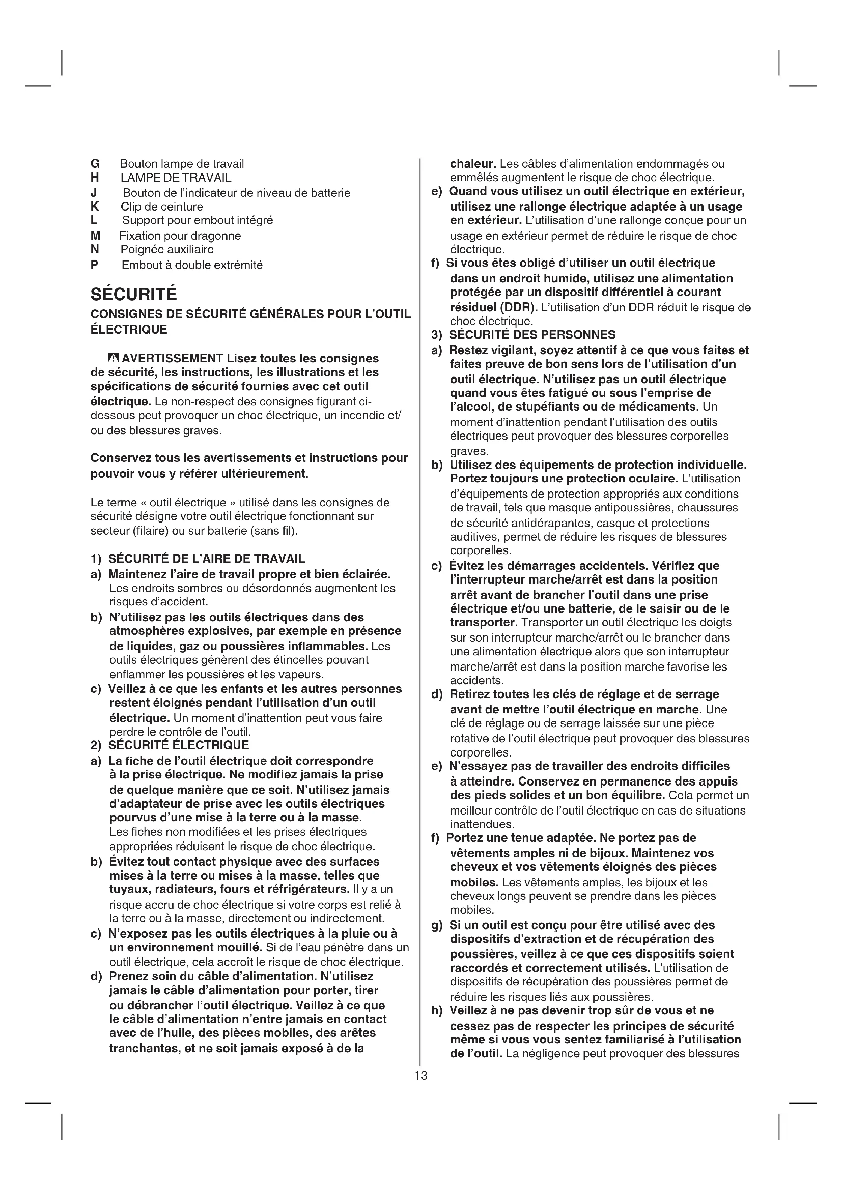 a) Restez vigilant, soyez attentif à ce que vous faites et faites preuve de bon sens lors de l’utilisation d’un outil électrique. N’utilisez pas un outil électrique quand vous êtes fatigué ou sous l’emprise de l’alcool, de stupéants ou de médicaments. Un moment d’inattention pendant l’utilisation des outils électriques peut provoquer des blessures corporelles graves. b) Utilisez des équipements de protection individuelle. Portez toujours une protection oculaire. L’utilisation d’équipements de protection appropriés aux conditions de travail, tels que masque antipoussières, chaussures de sécurité antidérapantes, casque et protections auditives, permet de réduire les risques de blessures corporelles. c) Évitez les démarrages accidentels. Vériez que l’interrupteur marche/arrêt est dans la position arrêt avant de brancher l’outil dans une prise électrique et/ou une batterie, de le saisir ou de le transporter. Transporter un outil électrique les doigts sur son interrupteur marche/arrêt ou le brancher dans une alimentation électrique alors que son interrupteur marche/arrêt est dans la position marche favorise les accidents. d) Retirez toutes les clés de réglage et de serrage avant de mettre l’outil électrique en marche. Une clé de réglage ou de serrage laissée sur une pièce rotative de l’outil électrique peut provoquer des blessures corporelles. e) N’essayez pas de travailler des endroits diciles à atteindre. Conservez en permanence des appuis des pieds solides et un bon équilibre. Cela permet un meilleur contrôle de l’outil électrique en cas de situations inattendues. f) Portez une tenue adaptée. Ne portez pas de vêtements amples ni de bijoux. Maintenez vos cheveux et vos vêtements éloignés des pièces mobiles. Les vêtements amples, les bijoux et les cheveux longs peuvent se prendre dans les pièces mobiles. g) Si un outil est conçu pour être utilisé avec des dispositifs d’extraction et de récupération des poussières, veillez à ce que ces dispositifs soient raccordés et correctement utilisés. L’utilisation de dispositifs de récupération des poussières permet de réduire les risques liés aux poussières. h) Veillez à ne pas devenir trop sûr de vous et ne cessez pas de respecter les principes de sécurité même si vous vous sentez familiarisé à l’utilisation de l’outil. La négligence peut provoquer des blessures G Bouton lampe de travail