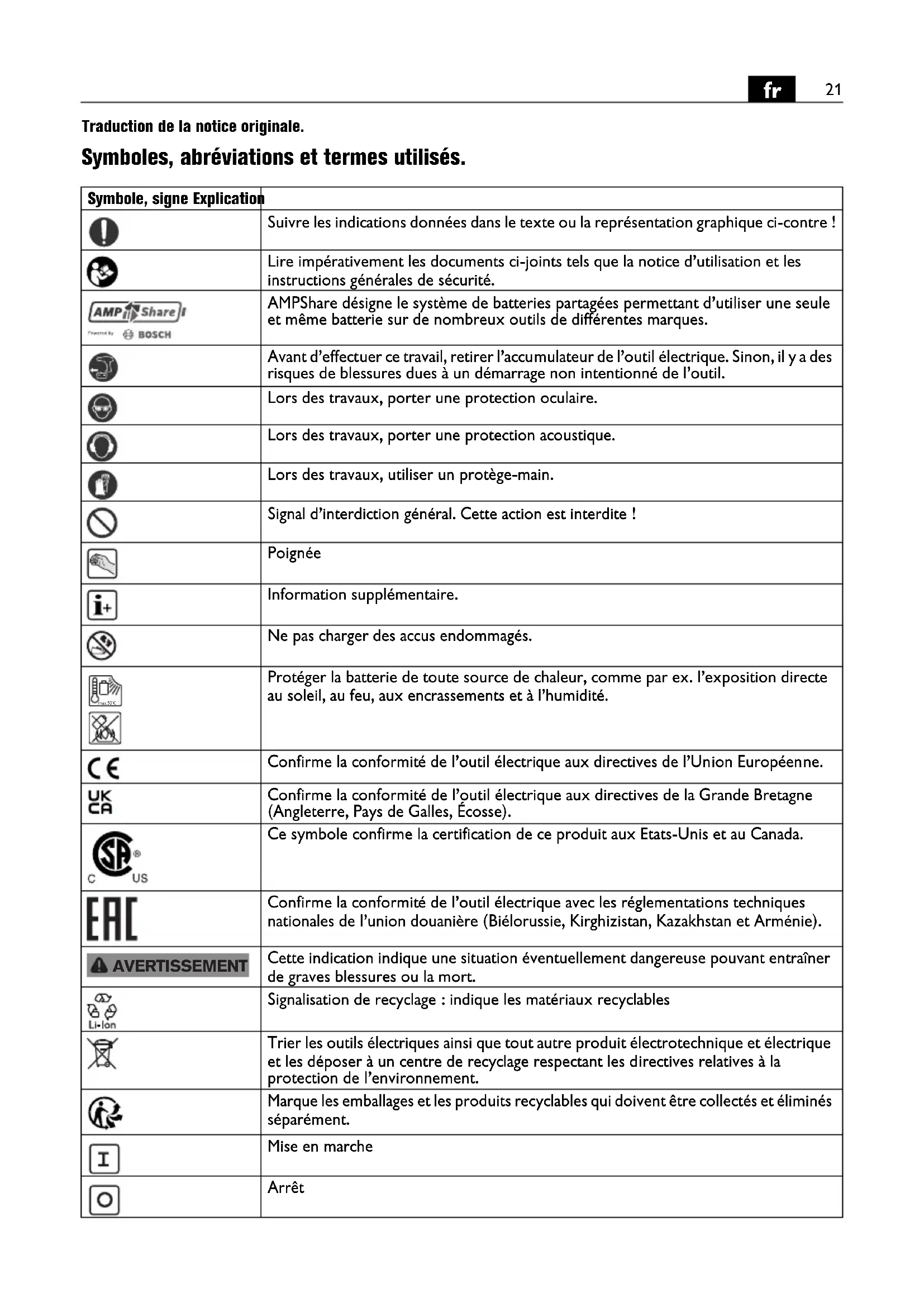 Traduction de la notice originale. Symboles, abréviations et termes utilisés. Symbole, signe Explication Suivre les indications données dans le texte ou la représentation graphique ci-contre ! Lire impérativement les documents ci-joints tels que la notice d’utilisation et les instructions générales de sécurité. AMPShare désigne le système de batteries partagées permettant d’utiliser une seule et même batterie sur de nombreux outils de différentes marques. Avant d’effectuer ce travail, retirer l’accumulateur de l’outil électrique. Sinon, il y a des risques de blessures dues à un démarrage non intentionné de l’outil. Lors des travaux, porter une protection oculaire. Lors des travaux, porter une protection acoustique. Lors des travaux, utiliser un protège-main. Signal d’interdiction général. Cette action est interdite ! Poignée Information supplémentaire. Ne pas charger des accus endommagés. Protéger la batterie de toute source de chaleur, comme par ex. l’exposition directe au soleil, au feu, aux encrassements et à l’humidité. Confirme la conformité de l’outil électrique aux directives de l’Union Européenne. Confirme la conformité de l’outil électrique aux directives de la Grande Bretagne (Angleterre, Pays de Galles, Écosse). Ce symbole confirme la certification de ce produit aux Etats-Unis et au Canada. Confirme la conformité de l’outil électrique avec les réglementations techniques nationales de l’union douanière (Biélorussie, Kirghizistan, Kazakhstan et Arménie). Cette indication indique une situation éventuellement dangereuse pouvant entraîner de graves blessures ou la mort. Signalisation de recyclage : indique les matériaux recyclables Trier les outils électriques ainsi que tout autre produit électrotechnique et électrique et les déposer à un centre de recyclage respectant les directives relatives à la protection de l’environnement. Marque les emballages et les produits recyclables qui doivent être collectés et éliminés séparément. Mise en marche Arrêt max.50°C AVERTISSEMENT22