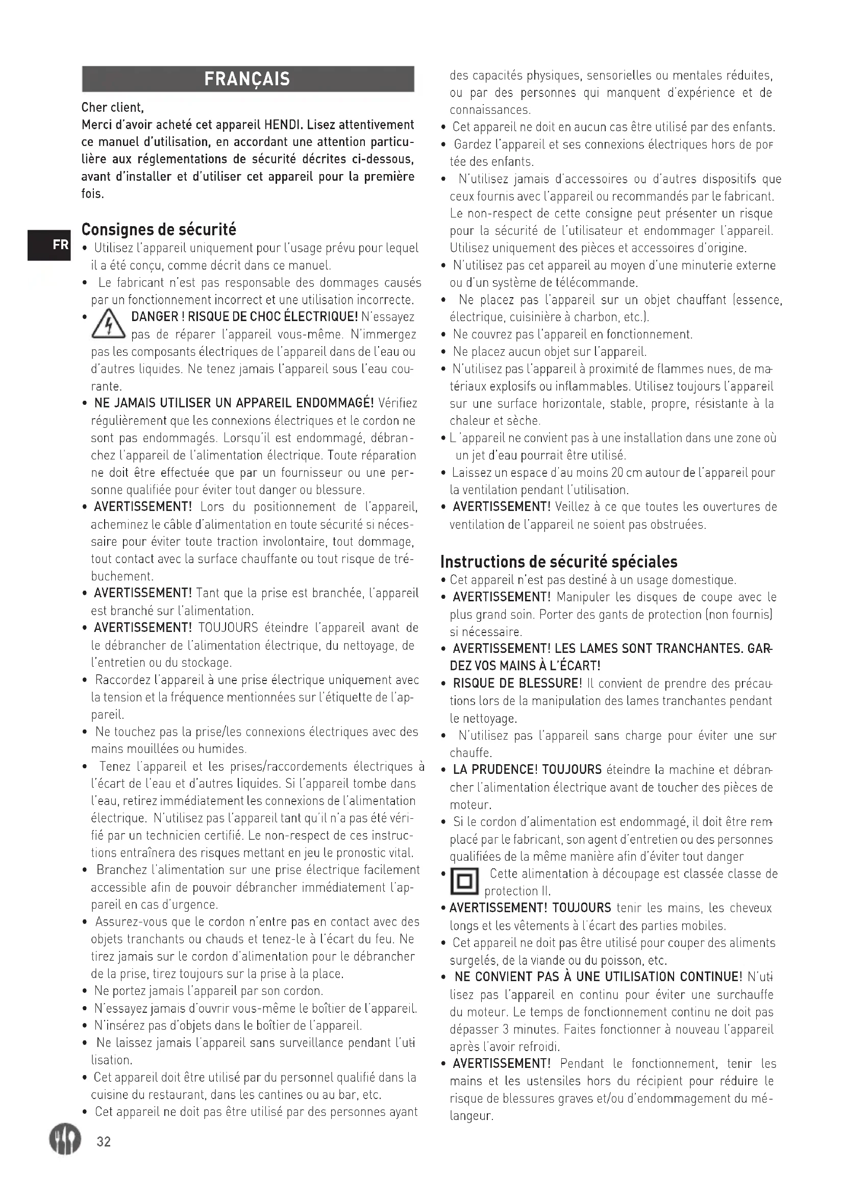 FRANÇAIS Cher client, Merci d’avoir acheté cet appareil HENDI. Lisez attentivement ce manuel d’utilisation, en accordant une attention particu
