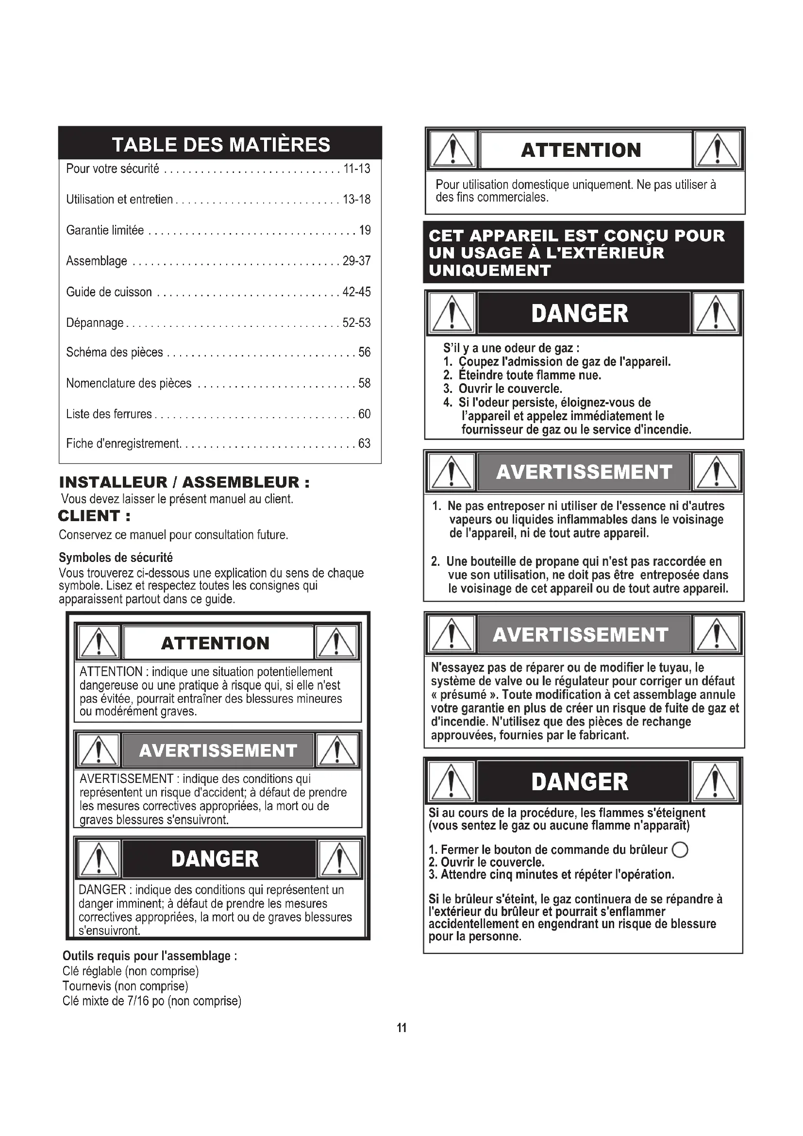 - INSTALLEUR / ASSEMBLEUR : Vous devez laisser le présent manuel au client. CLIENT : Conservez ce manuel pour consultation future. N'essayez pas de réparer ou de modifier le tuyau, le système de valve ou le régulateur pour corriger un défaut « présumé ». Toute modification à cet assemblage annule votre garantie en plus de créer un risque de fuite de gaz et d'incendie. N'utilisez que des pièces de rechange approuvées, fournies par le fabricant. AVERTISSEMENT CET APPAREIL EST CONÇU POUR UN USAGE À L'EXTÉRIEUR UNIQUEMENT DANGER Si au cours de la procédure, les flammes s'éteignent (vous sentez le gaz ou aucune flamme n'apparaît)1. Fermer le bouton de commande du brûleur 2. Ouvrir le couvercle.3. Attendre cinq minutes et répéter l'opération. Si le brûleur s'éteint, le gaz continuera de se répandre à l'extérieur du brûleur et pourrait s'enflammer accidentellement en engendrant un risque de blessure pour la personne. AVERTISSEMENT AVERTISSEMENT : indique des conditions qui représentent un risque d'accident; à défaut de prendre les mesures correctives appropriées, la mort ou de graves blessures s'ensuivront. ATTENTION : indique une situation potentiellement dangereuse ou une pratique à risque qui, si elle n'est pas évitée, pourrait entraîner des blessures mineures ou modérément graves. ATTENTION DANGER : indique des conditions qui représentent un danger imminent; à défaut de prendre les mesures correctives appropriées, la mort ou de graves blessures s'ensuivront. DANGER ATTENTION Pour utilisation domestique uniquement. Ne pas utiliser à des fins commerciales. Outils requis pour l'assemblage :Clé réglable (non comprise)Tournevis (non comprise)Clé mixte de 7/16 po (non comprise) Pour votre sécurité p. 11