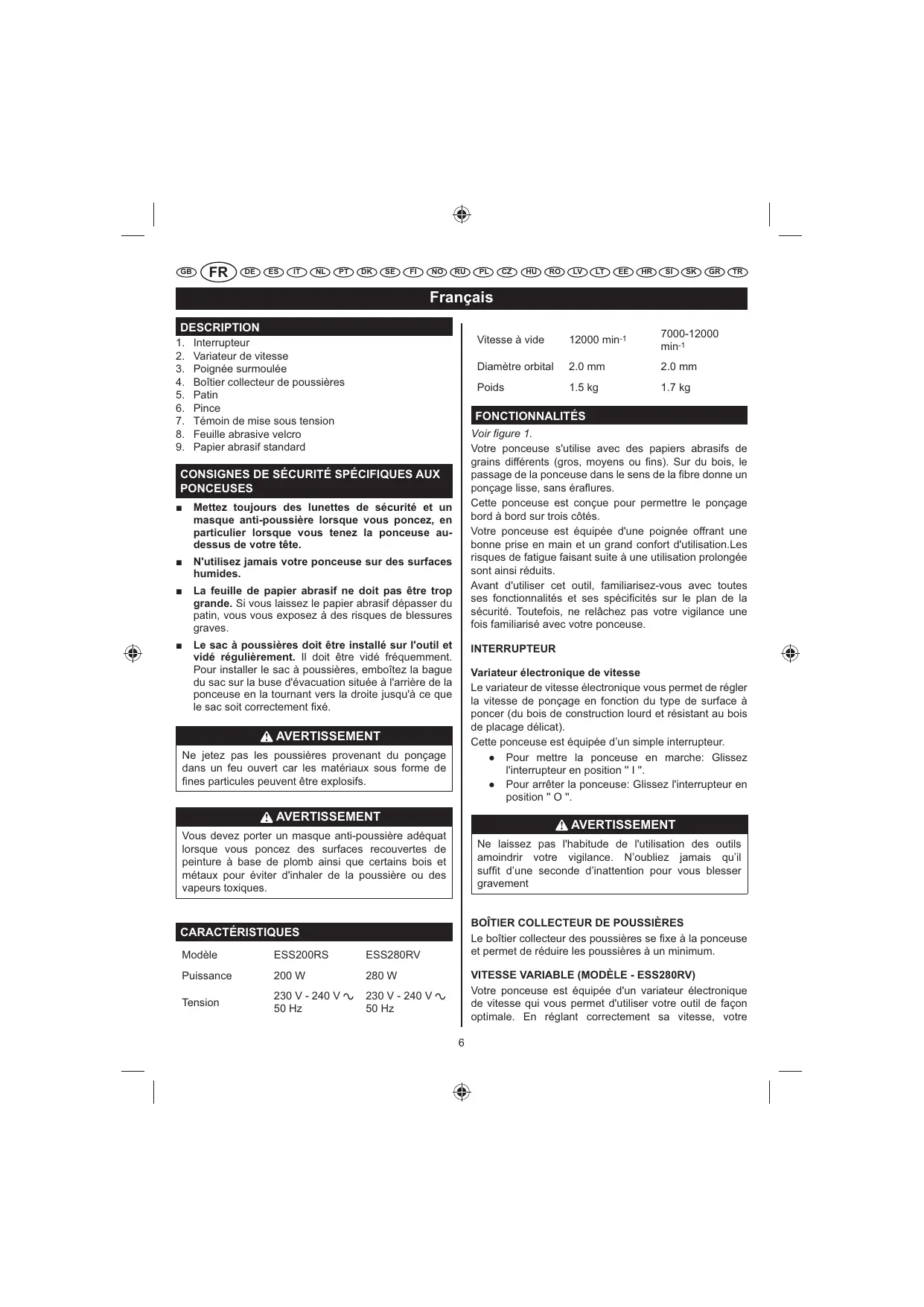 Le boîtier collecteur des poussières se Àxe à la ponceuse et permet de réduire les poussières à un minimum. CARACTÉRISTIQUES Modèle ESS200RS ESS280RV Puissance 200 W 280 W Tension 230 V - 240 V 50 Hz 230 V - 240 V 50 Hz VITESSE VARIABLE (MODÈLE - ESS280RV) Votre ponceuse est équipée d'un variateur électronique de vitesse qui vous permet d'utiliser votre outil de façon optimale. En réglant correctement sa vitesse, votre